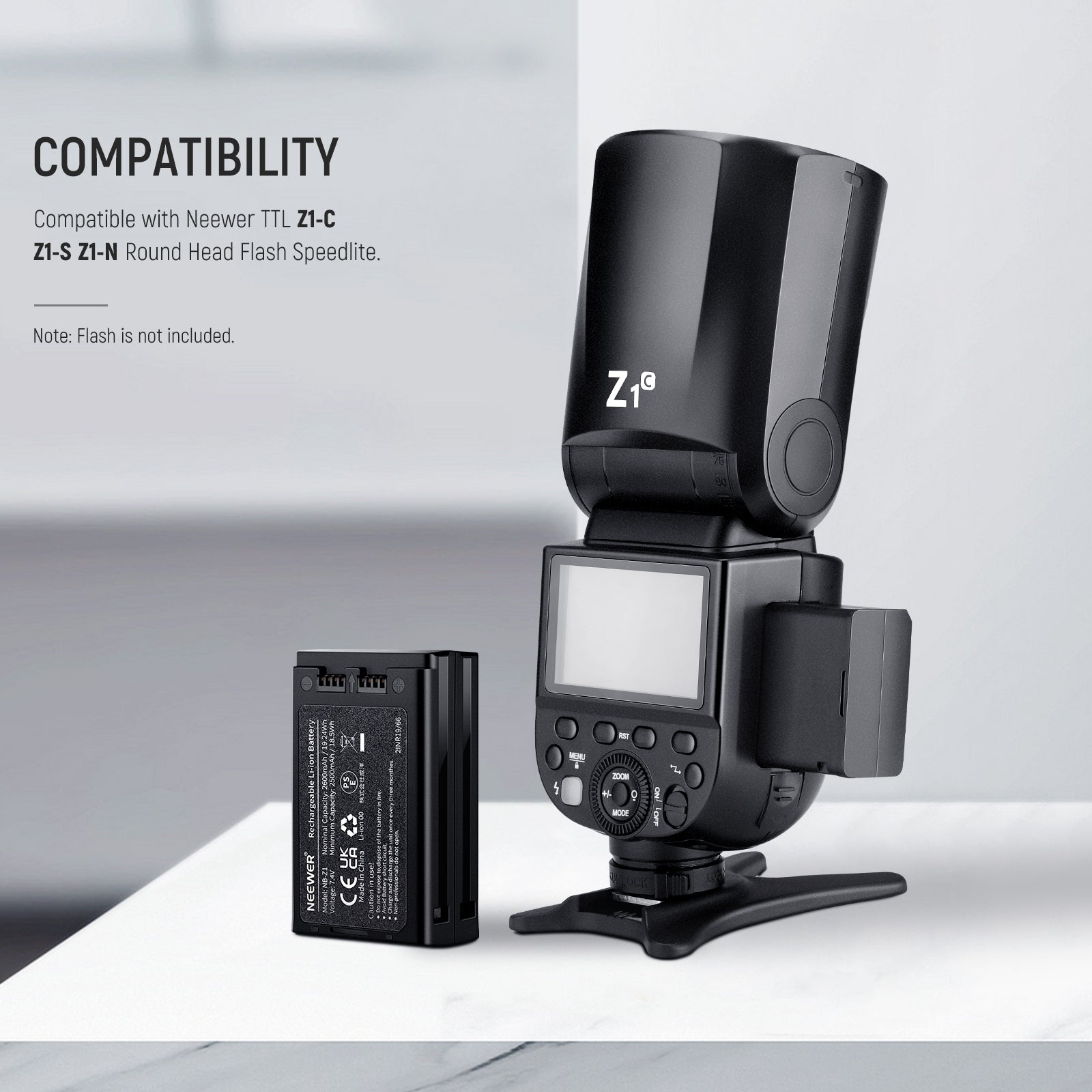 - Backup Battery for Z1/ Z2 Speedlite Flash- Want to power your Z1/ Z2 flash Speedlite without a pause Get this 7.4V/2600mAh lithium battery and USB charger kit, and you're all set. Exclusively compatible with NEEWER TTL Z1 or Z2 round head flash Speedlite. The package includes a lithium battery, a USB charger, and a USB Type A to Type C cable