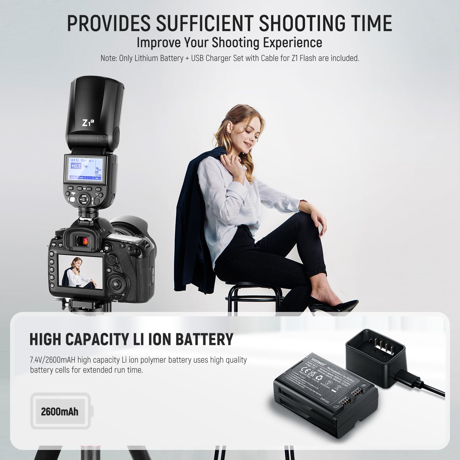 - High Capacity 2600mAh Lithium Battery- As a spare battery for Z1/ Z2 flash, this 7.4V/2600mAH high-performance lithium polymer battery greatly extends the battery life of your Speedlite. When the original battery is running out, put this backup battery in and charge the original one with the included charger