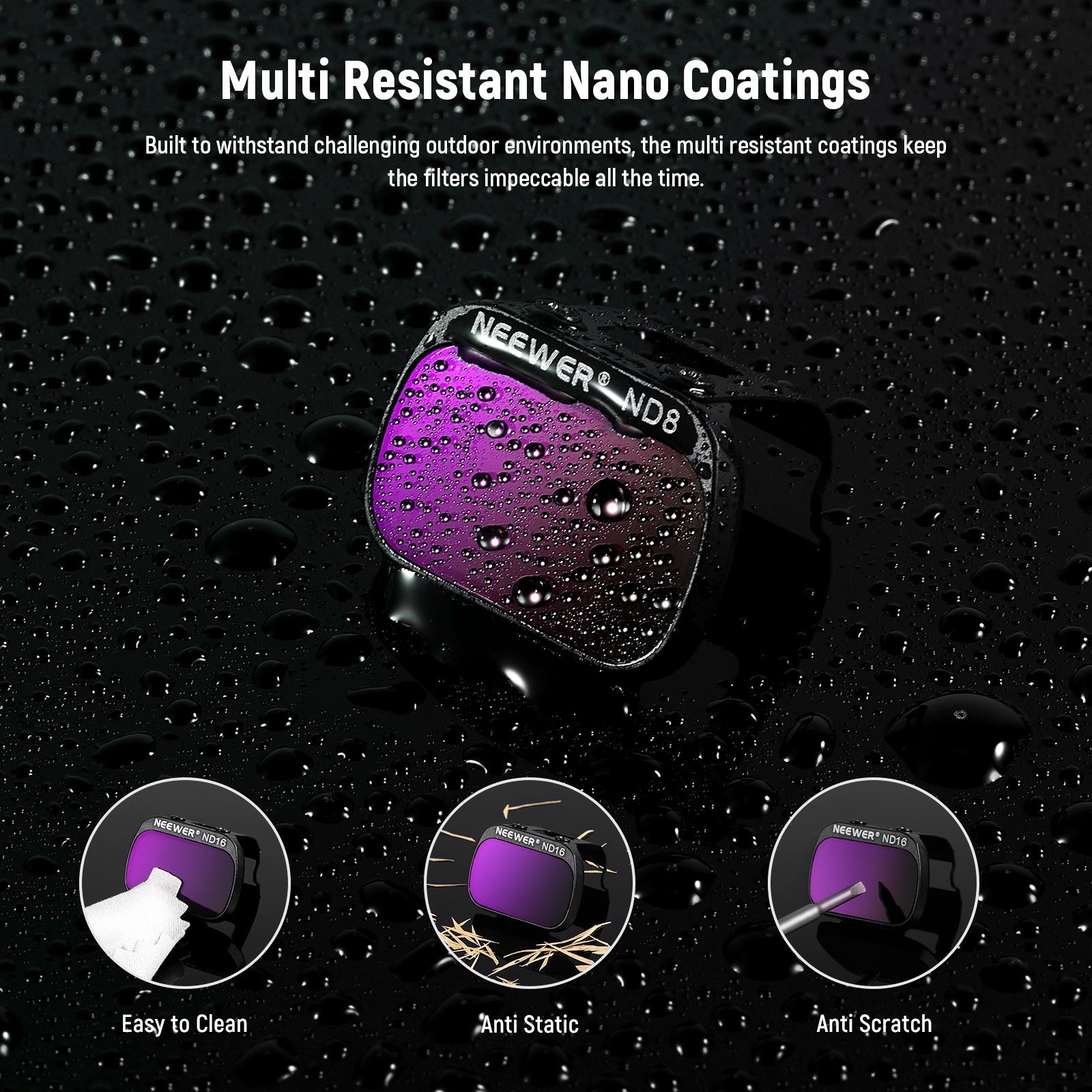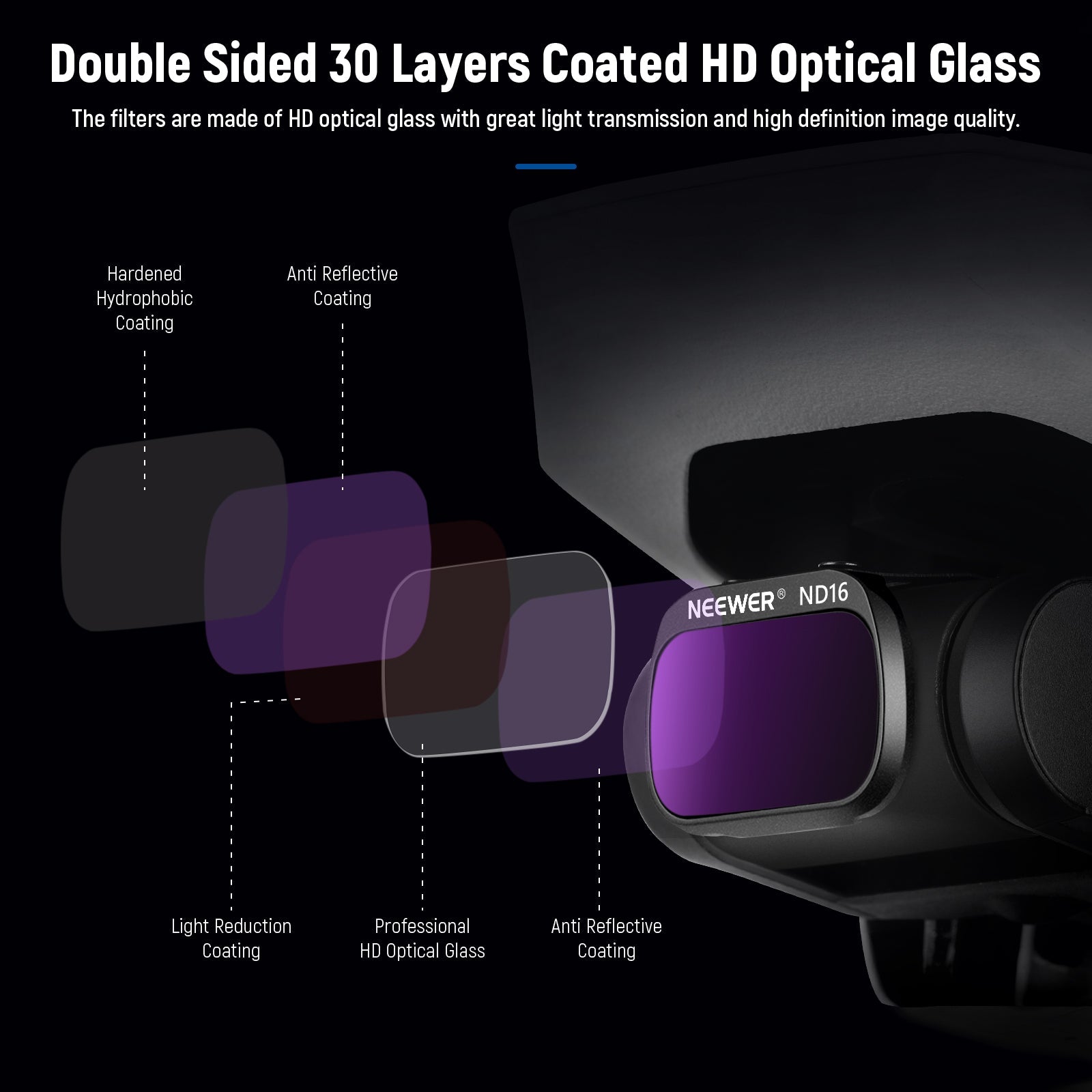 - 30 Layers NANO Coated HD Optical Glass- The filters are made of imported HD optical glass with great light transmission and high definition quality. The double-sided multi-layers of NANO coatings are water-repellent & scratch resistant, and oil-proof, effectively reducing glare and reflection.