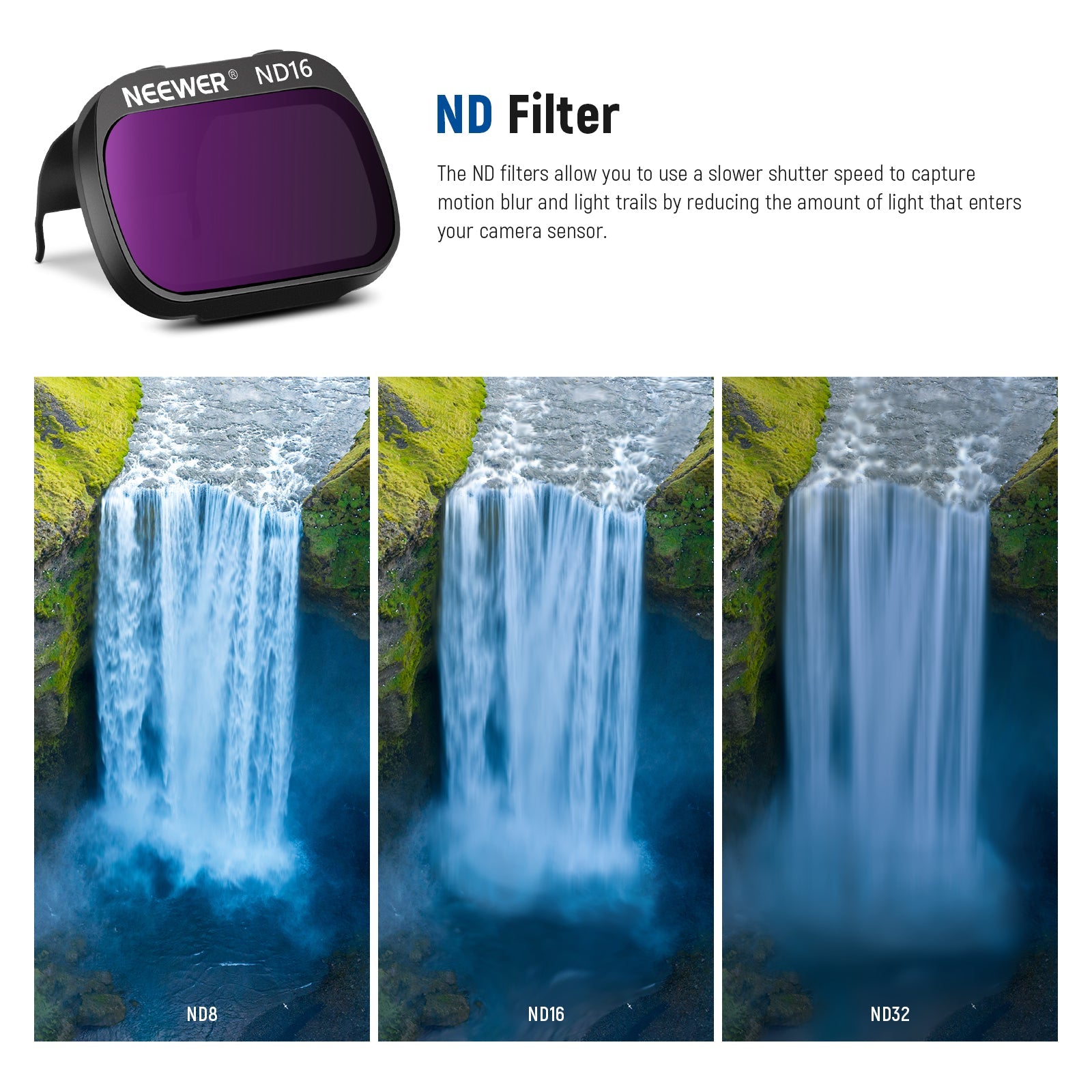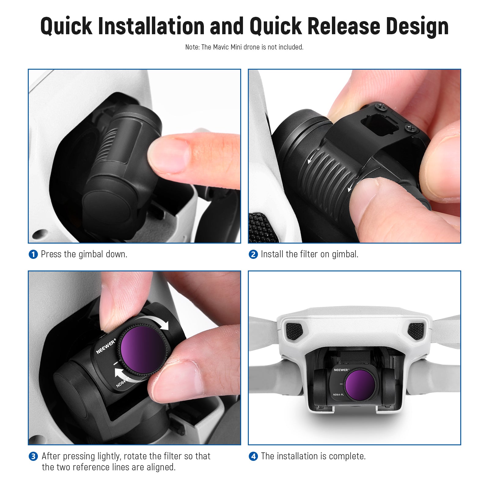 - Compatible with Mavic Mini/Mini 2/Mini SE- NEEWER 9 Packs polarizing neutral density Lens filter set is specifically designed for the Mavic Mini/Mavic Mini 2/Mini SE drone camera. Take this kit with you anywhere you go thanks to the plastic cases. The whole package includes 9 filters: CPL ND8 ND16 ND32 ND4PL ND8PL ND16PL ND32PL ND64PL.