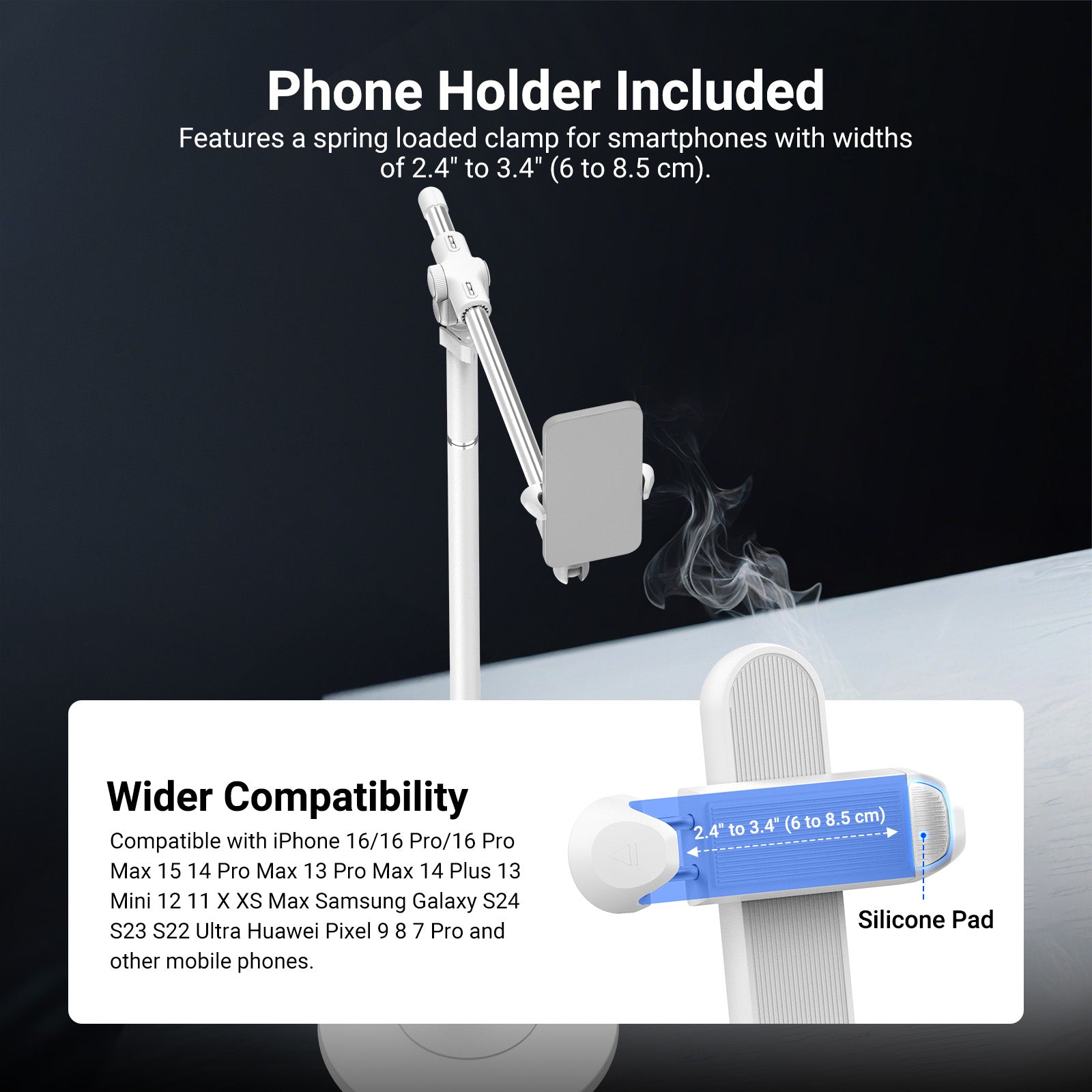 - Wide Compatibility- The floor stand comes with an adjustable clamp holder mount from 2.4 to 3.3 inches (6 to 8.5 cm), compatible with iPhone 16/16 Pro/16 Pro Max 15 14 Pro Max 13 Pro Max 14 Plus 13 Mini 12 11 X XS Max Samsung Galaxy S24 S23 S22 Ultra Huawei Pixel 9 8 7 Pro and other mobile phones for filming. The non slip pads within the clamp enhance grip and prevent slipping
