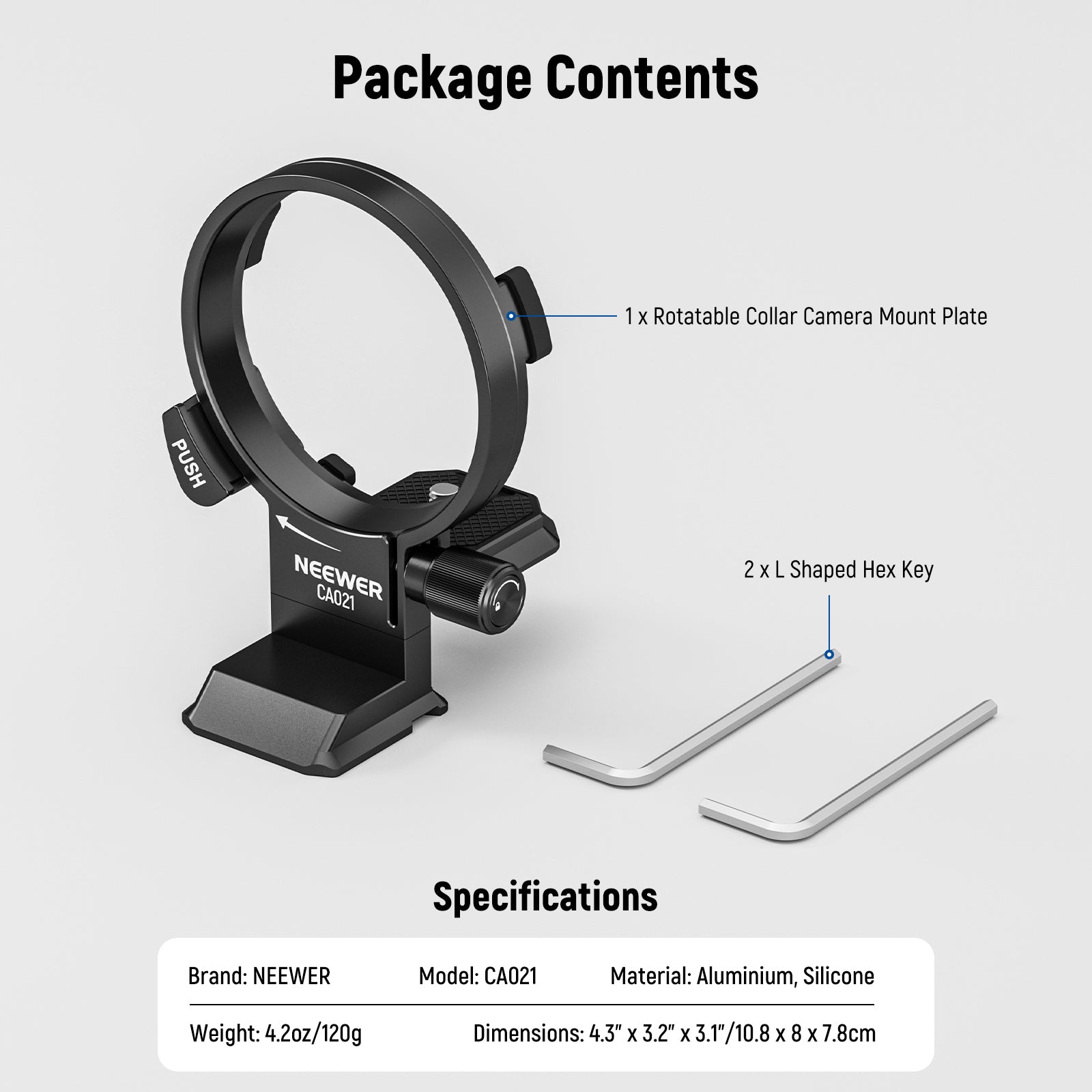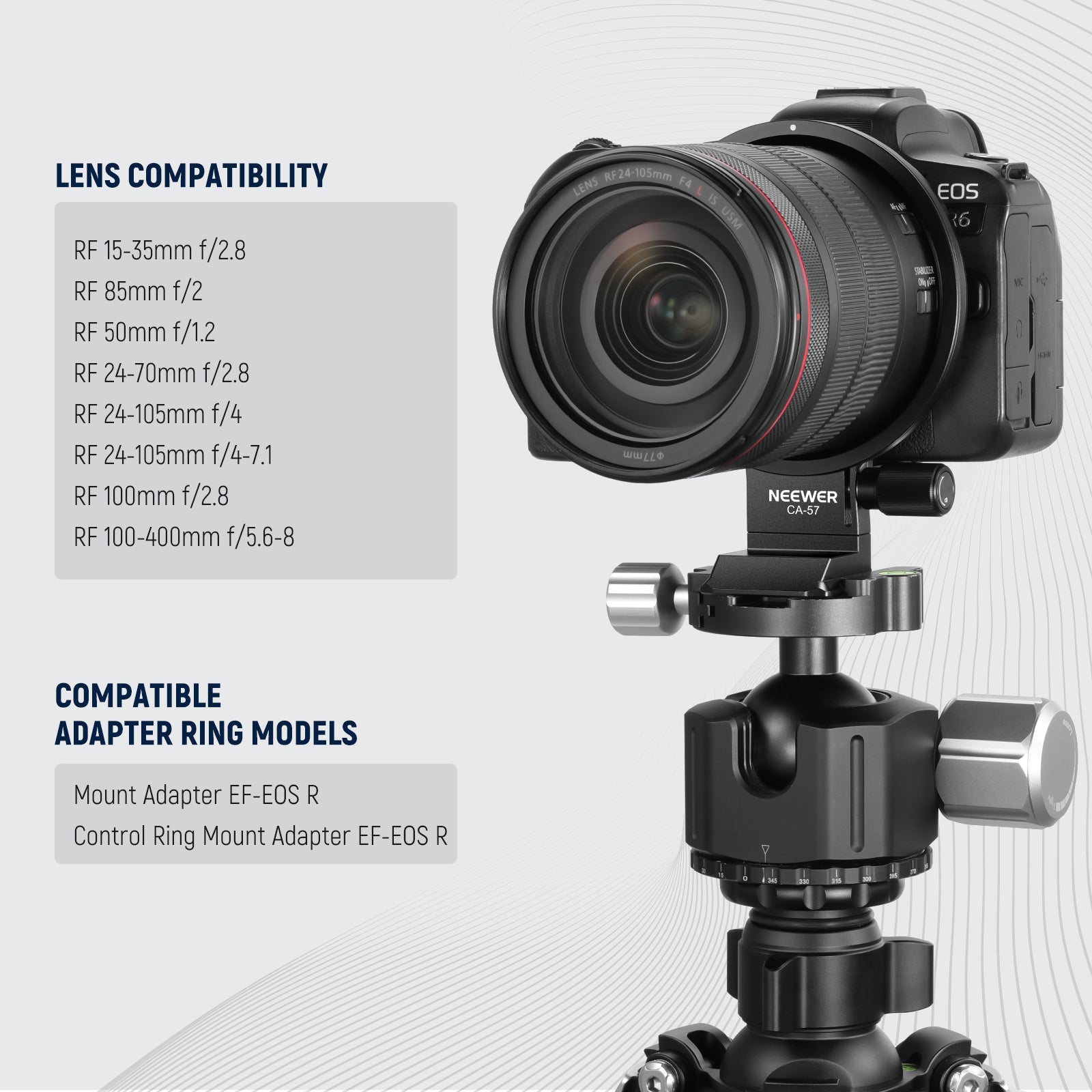 - Flexible Angles & Improved Balance- This NEEWER CA-57 rotatable collar camera mount plate enables seamless quick horizontal to vertical shots with superior stability, and improves balance when using heavy lenses. Compatible with Canon R5 / R5C / R6 / R6 Mark II full frame cameras, compatible with Canon EF EOS R mount adapter and control ring mount adapter, compatible with RF 24-70mm f/2.8 24-105mm f/4 24-105mm f/4-7.1 85mm f/2 50mm f/1.2 100-400mm f/5.6-8 15-35mm f/2.8 100mm f/2.8 camera lenses