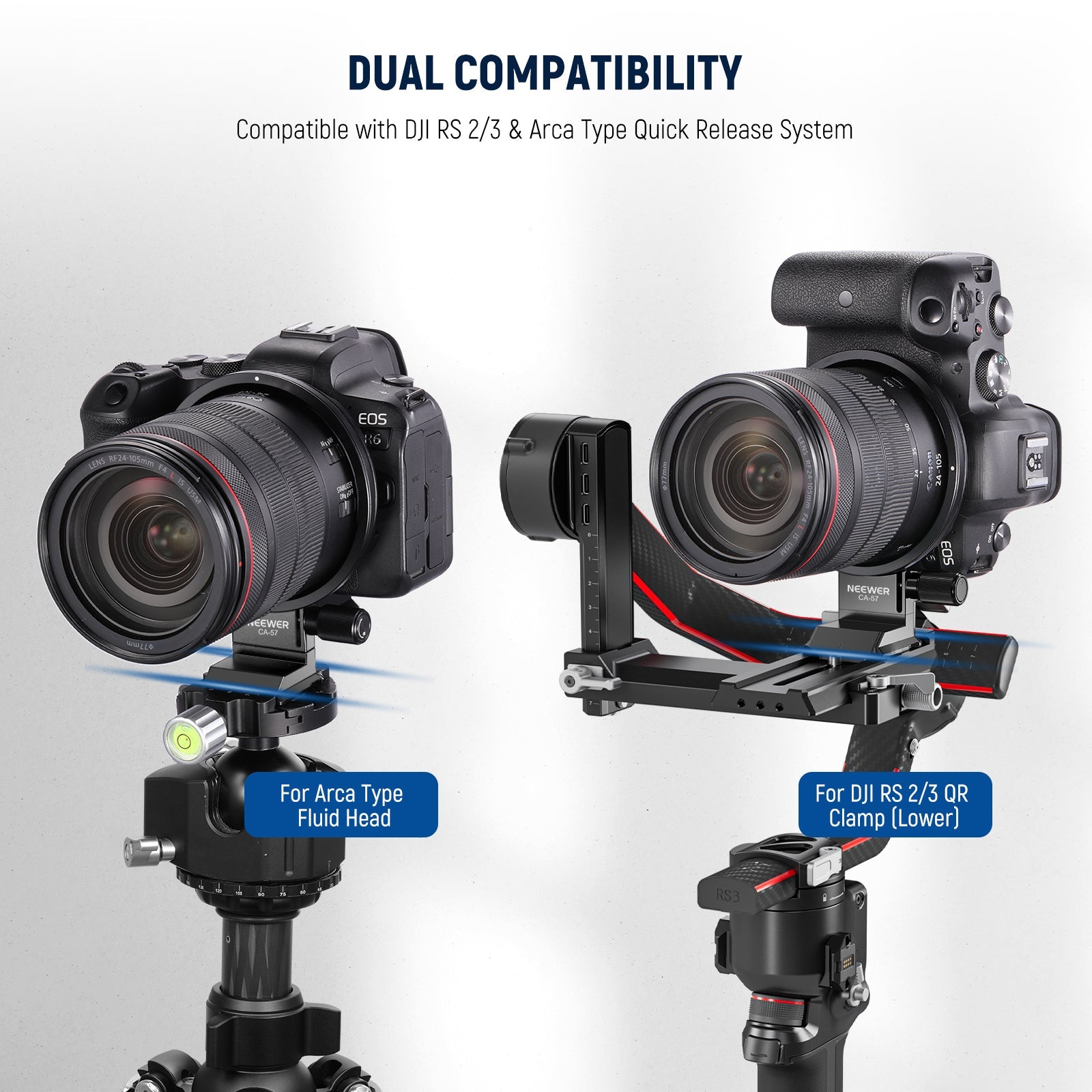 - Quick Release Camera Mounting- This vertical camera tripod lens mount is equipped with a quick release base plate that is both compatible with Arca Swiss DJI RS3 Pro RS3 Mini RS3 RS2 Pro RS2 vertical camera mount, and easily installed on any tripod, gimbal stablizer, monopod, and camera slider with an identical mounting system. The 4 x 1/4" and 1 x 3/8" threads on the bracket bottom for camera rigs, hand grips, magic arms and more
