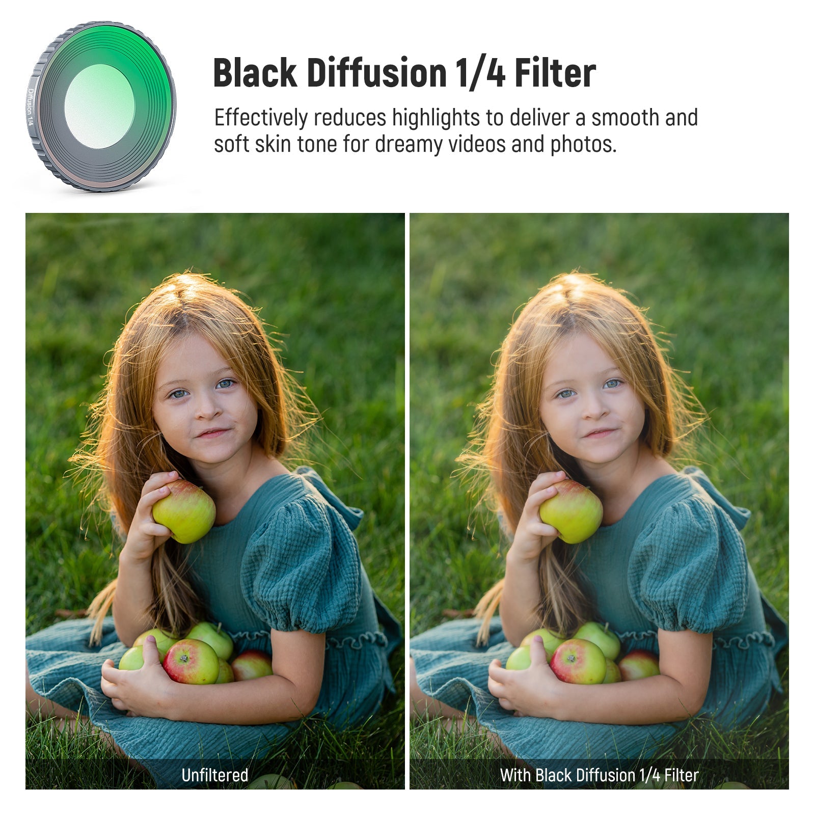 - Cinematic Soft & Dreamy Effect- The?black diffusion 1/4 filter?can smooth skin texture, diffuse highlights, and add a dreamy effect to your shots, perfect for portrait photography, selfies, and personal vlogs