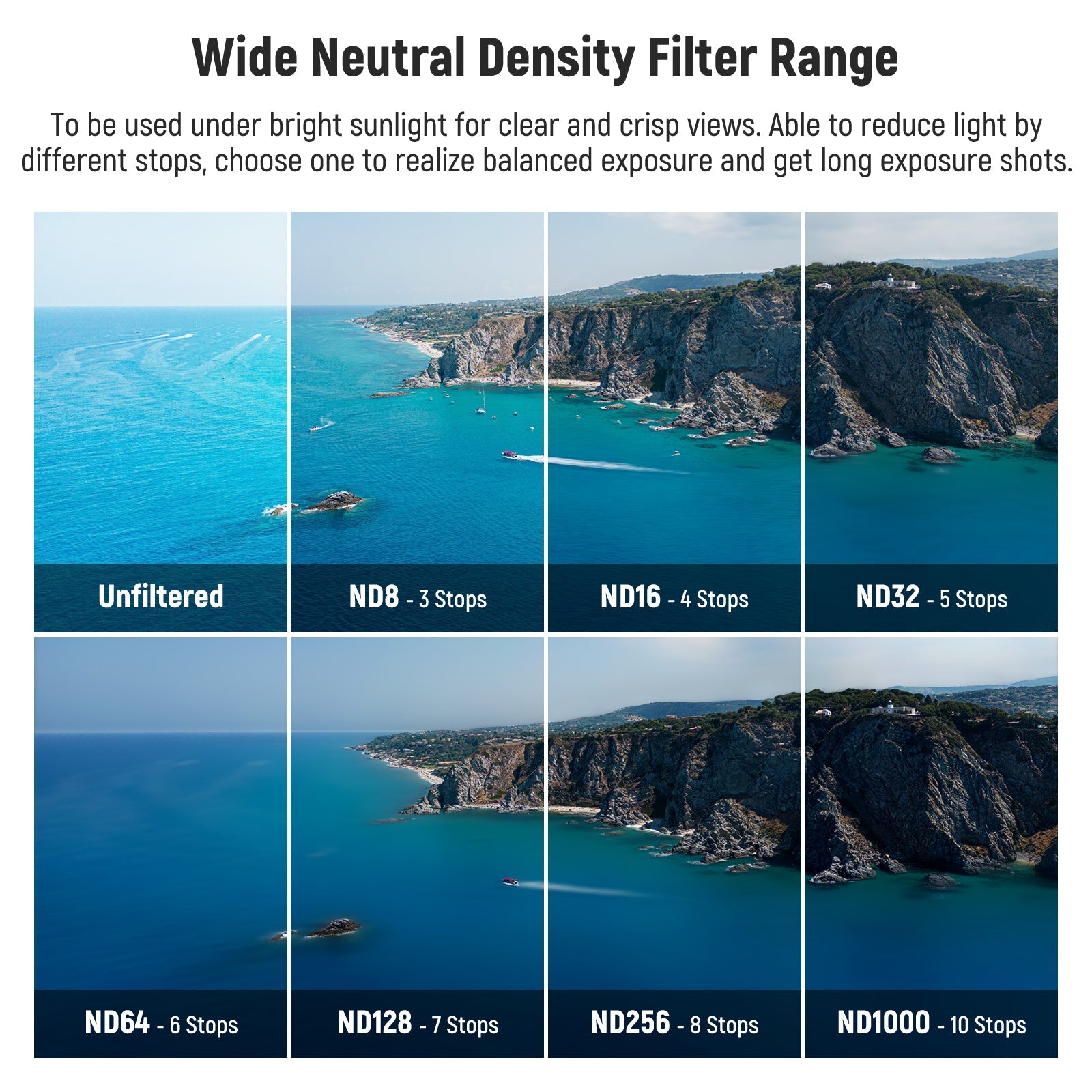 - Wide Neutral Density Filter Range- Neutral density filters are essential for Mini 3/Mini 3 Pro to fly and film under bright sunlight for clear and crisp view. From ND8, ND16, ND32, ND64, ND128, ND256, to ND1000, this drone filter set covers a wide range of light transmittance levels and enables users to easily handle various lighting conditions. Able to reduce light by different stops, choose one for balanced exposure and get long exposure shots