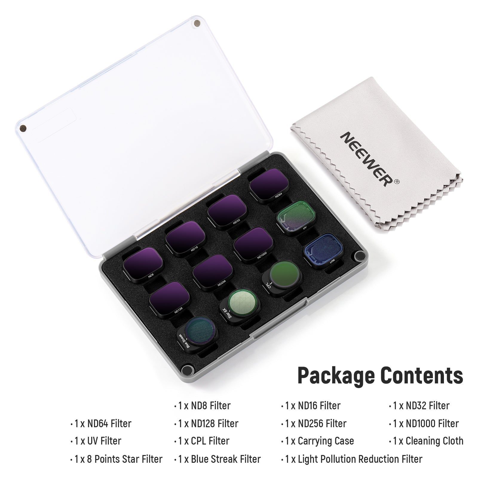 - Complete Drone Lens Filter Kit for Mini 3/Mini 3 Pro- This 12 in 1 drone filter kit is specifically designed to be compatible with DJI Mini 3/DJI Mini 3 Pro. It helps you create cinematic video footage with 12 kinds of filters available at your fingertip: ND8, ND16, ND32, ND64, ND128, ND256, ND1000, UV, and CPL Filter, as well as blue streak filter, light pollution reduction filter, and 8 points star filter