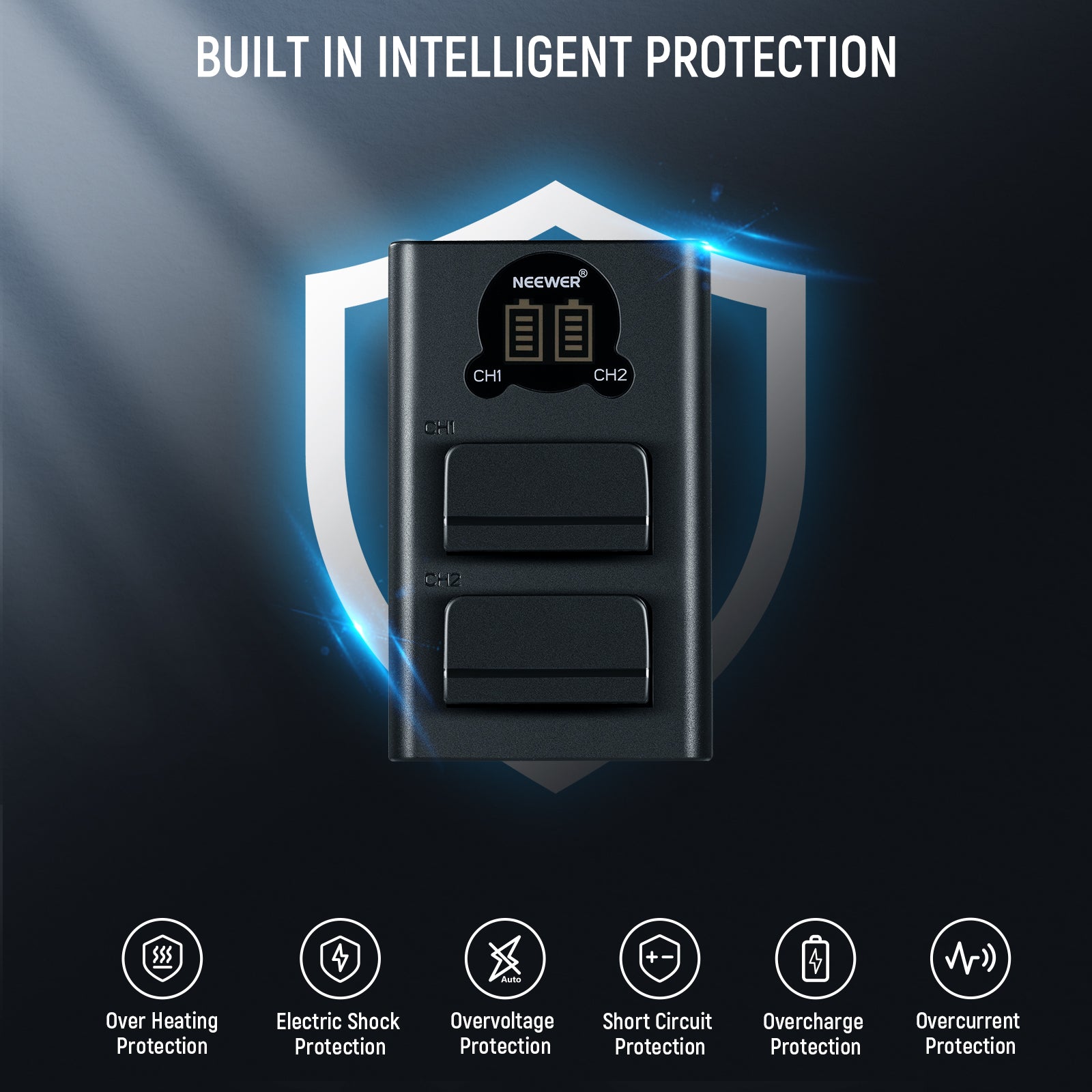 - LCD Display & Quick Charging- Featuring an intelligent LCD display that shows the current charging status in real time, this dual charger has a maximum output of 8.7V/1x 700mA or 2 x 500mA, you can charge two EN-EL25 batteries simultaneously in as little as 3 hours