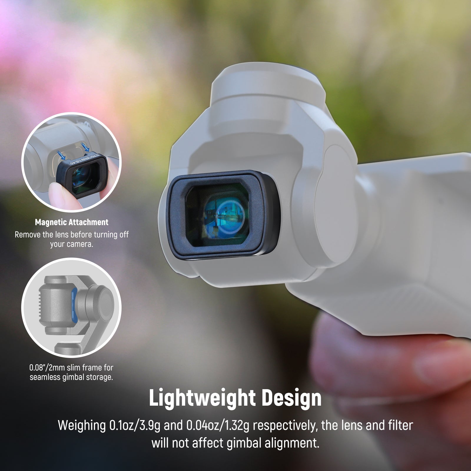 • Swift & Secure Magnetic Attachment- With built in strong magnets, the CPL filter and wide angle lens can be quickly attached to your camera and remain in place during shooting. The ultra thin design ensures precise gimbal calibration and seamless storage. Notes: When using wide angle/macro lenses or ND, CPL filters, please do not apply any protective film to the camera. When attached to the Pocket 3, the wide angle lens cannot be used together with ND, CPL, or other filters