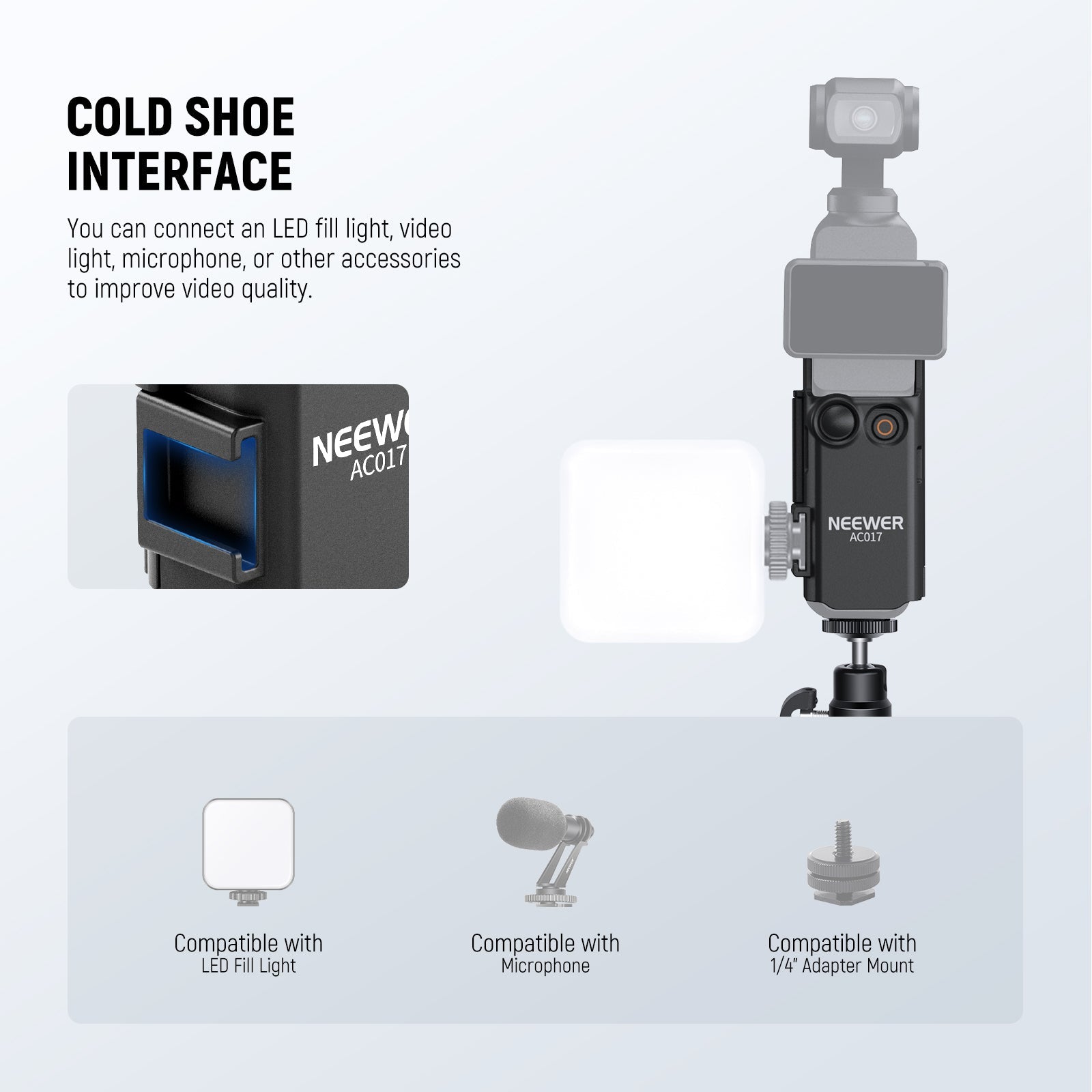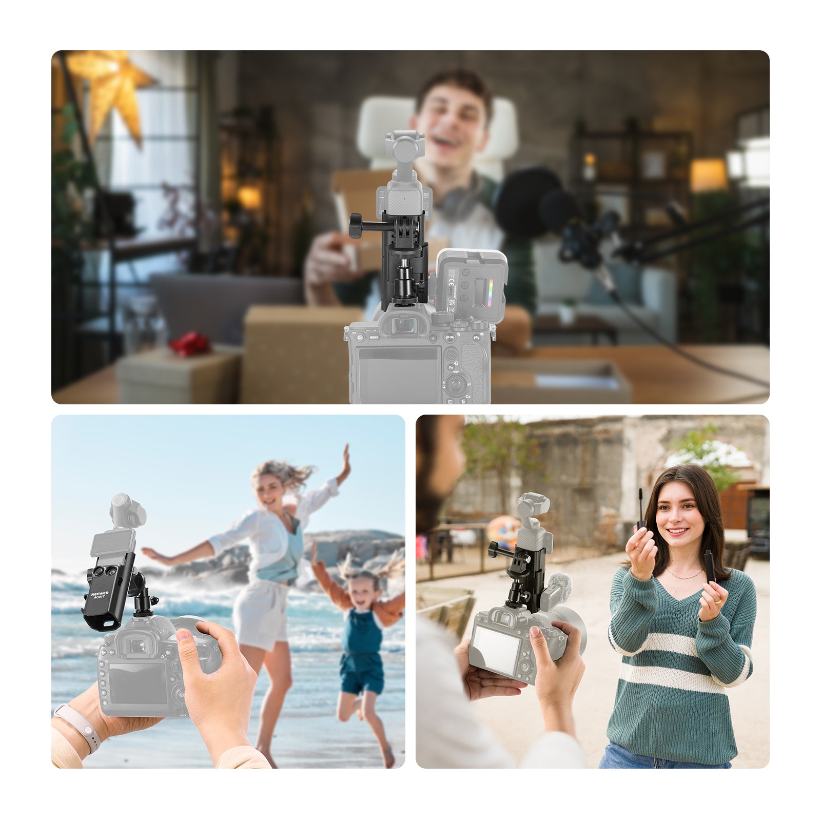 - Dual Camera Setup Kit for Pocket 3- NEEWER GP-68 gimbal camera case mount accessories kit includes an extension adapter mount compatible with DJI Osmo Pocket 3 and its Creator Combo, an adapter bracket, a cold shoe ball head, and a T shaped bolt. Designed for attaching a Pocket 3 to another camera with a cold shoe to simultaneously record footage from two perspectives, perfect for YouTube vlogging, advanced action packed filmmaking and other professional shots
