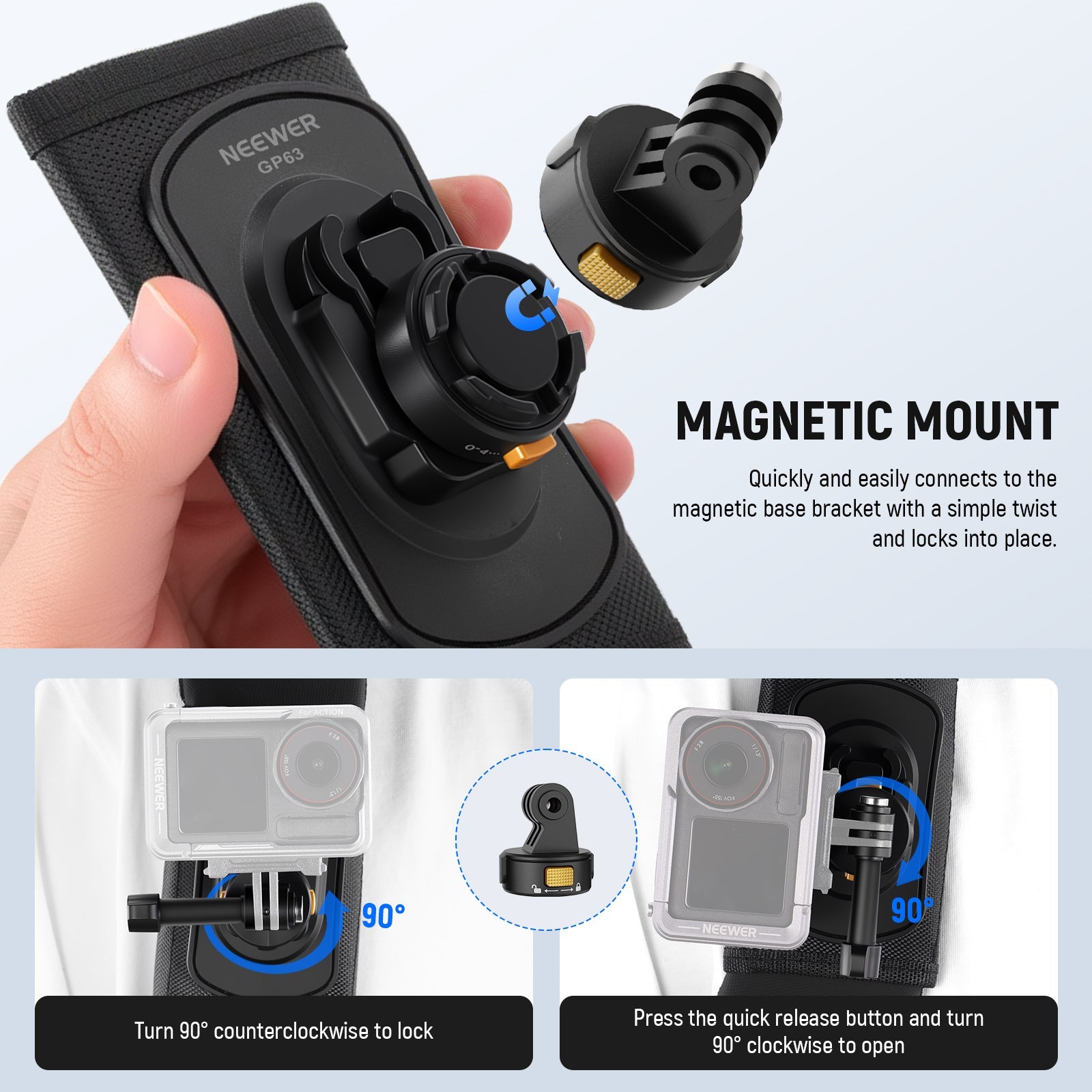 - Quick Release & Safety Assured- Simultaneously press the quick release buttons on both sides and rotate the mount 90° to detach the action camera. This dual button design prevents accidental disengagement, providing greater protection for your equipment