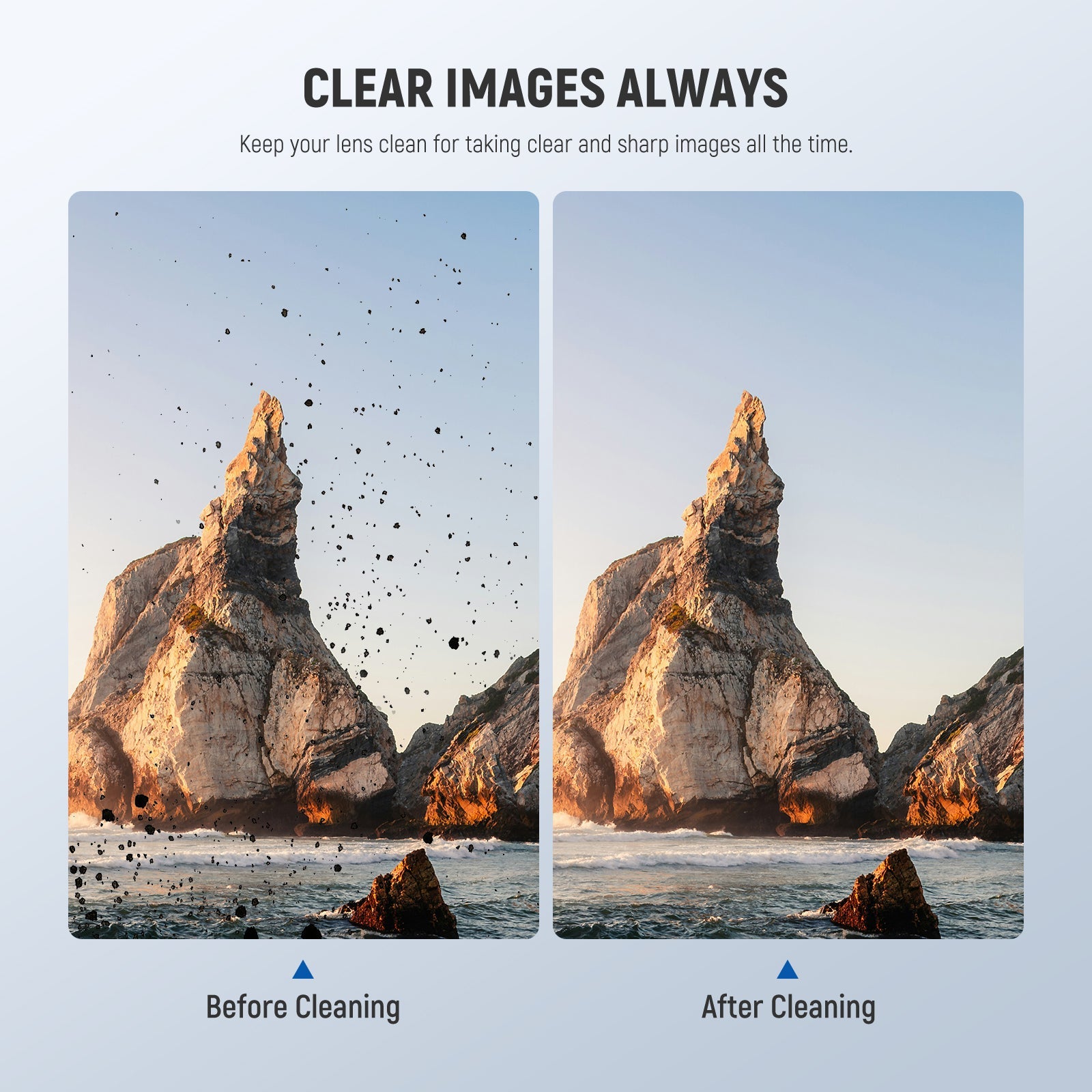 - Double Head Lens Brush Pen- The retractable brush pen features two ends—a soft brush for removing dust from the lens surface and a firm brush for cleaning narrow areas like lens grooves or keyboards