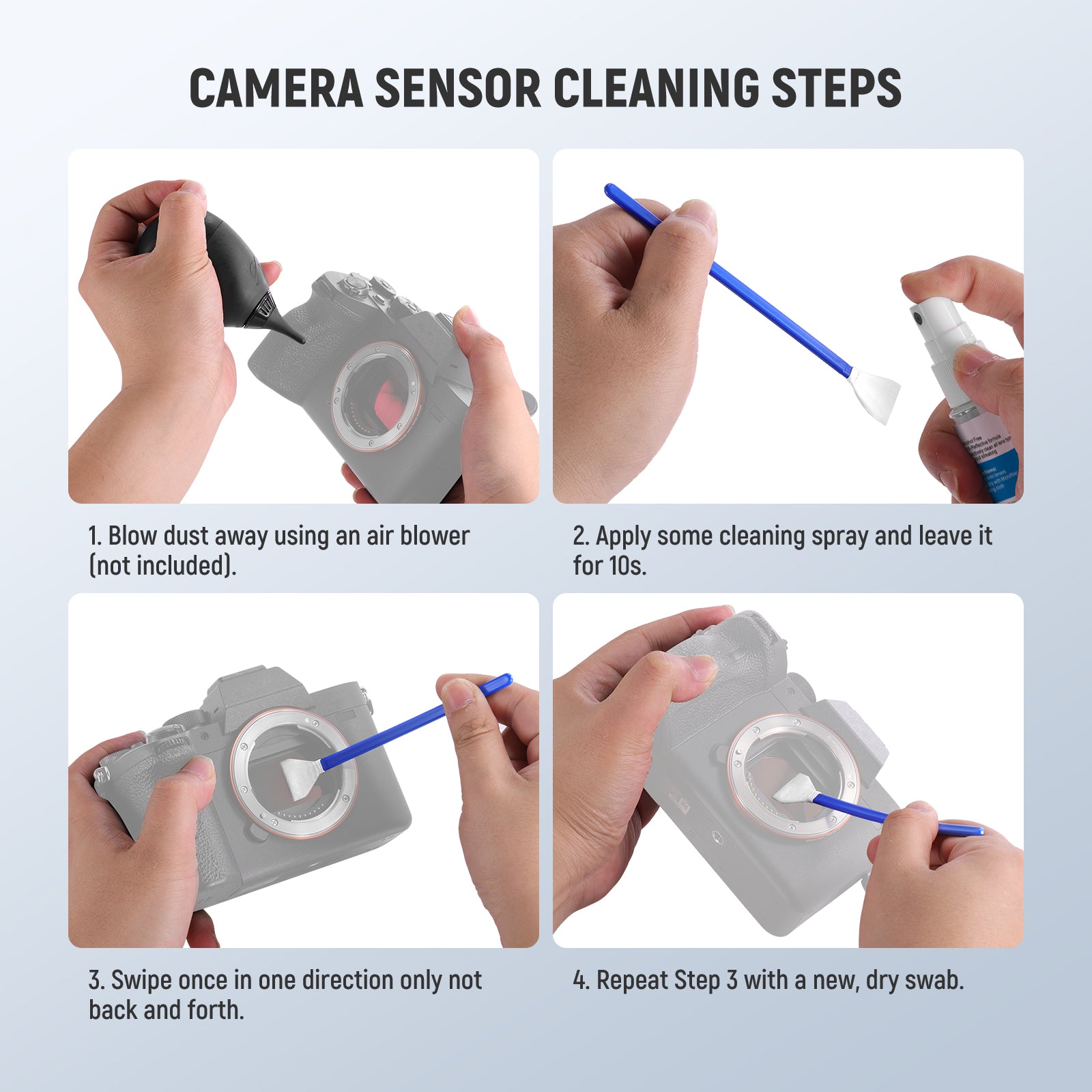 • Professional Camera Cleaning Kit- The cleaning accessories kit includes 10 x Cleaning Swab for 24mm Full Frame Sensor, 1 x Cleaner Spray, 1 x Cleaning Cloth—safe to use on all electronics, coated lenses, and camera sensors