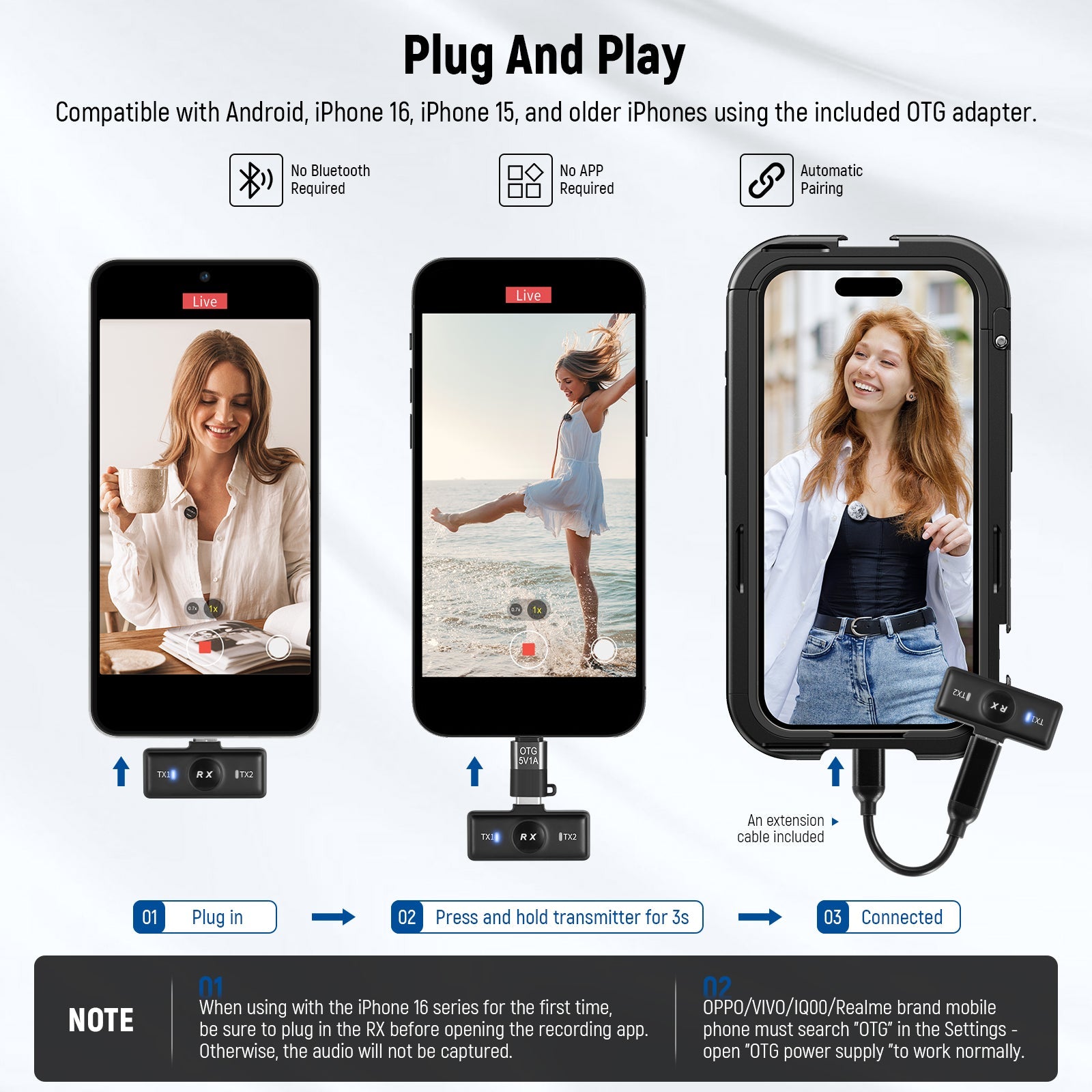 - Plug and Play, Wide Compatibility- The TX and RX will automatically pair with each other without complex setup. The RX automatically pairs with your recording device when plugged in, no need to connect to Bluetooth or APP. This tiny external omnidirectional condenser cordless microphone mic accessories kit is compatible with iPhone 16 15 Pro Max Plus series iPad Pro, compatible with Samsung Galaxy S23 S24 Ultra, other Android cell phones, PCs, or laptops with a USB C interface