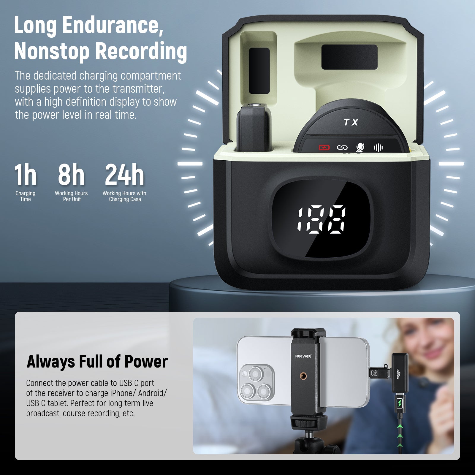 - 24H Battery Life & Easy Charging- The transmitter can work up to 8 hours and 24 hours with a charging case. An HD display on the compact charging case indicates the battery level of the transmitter. You can also directly power the transmitter with the included charging cable and charge your phone through the port of the RX without interrupting the recording