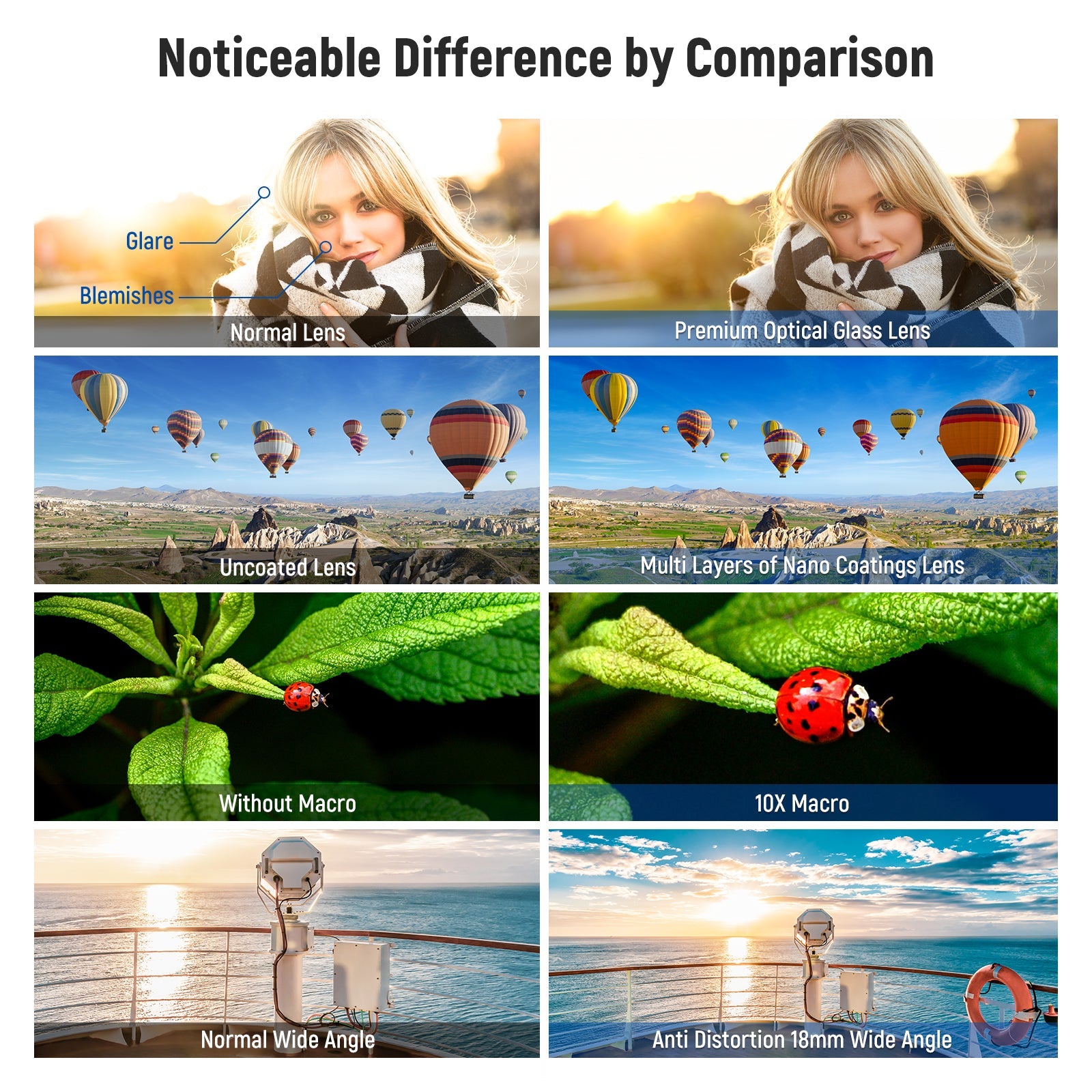 - Multi Coated Two Element Build- Built with 2 groups of two element HD optical corrective glasses, coupled with multi layers of Nano coatings to reduce reflection and glare, the wide angle macro lens delivers high resolution images with natural colors. No distortion or chromatic aberration