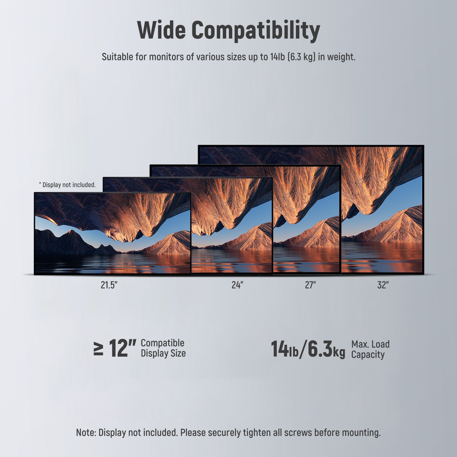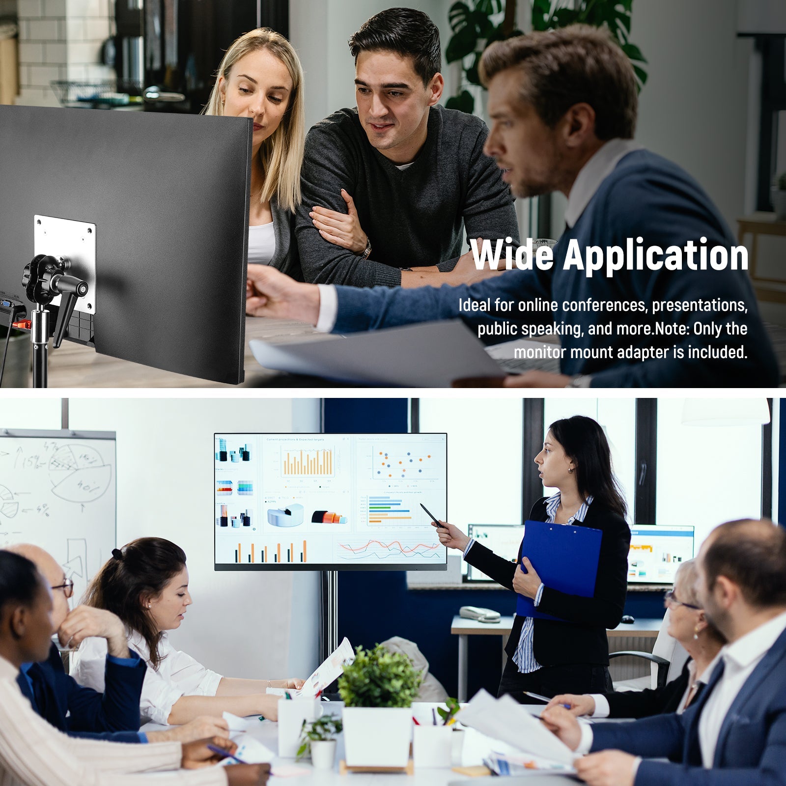 - Support Up to 14lb/6.3kg Monitors/Panels- Solidly constructed with premium aluminum alloy, this monitor mount adapter can stabilize a monitor up to 14lb (6.3kg) in weight. It is ideal for mounting monitors, displays or TVs of different sizes and can be used for meetings, presentations, public spaces or for production teams to view reference videos or materials