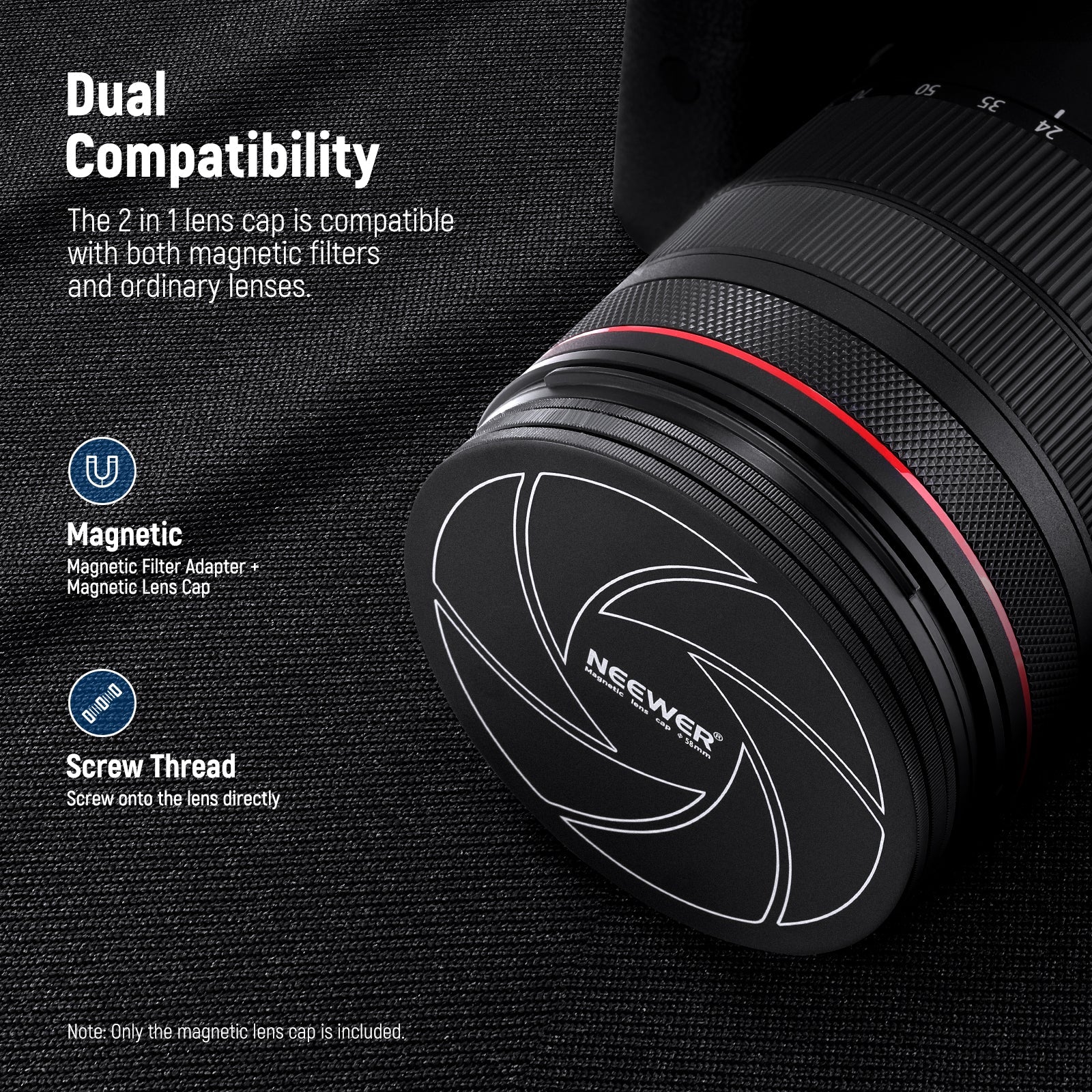 - Dual Compatibility-?An additional magnetic adapter ring is required to enable the lens cap magnetic function on non magnetic camera lenses. This magnetic metal lens cap is compatible with both a 67mm magnetic filter system and ordinary 67mm nonmagnetic lenses. Easily swap the magnetic lens cap on a magnetic camera lens filter, or screw it on an ordinary 67mm camera lens with the 67mm thread.
