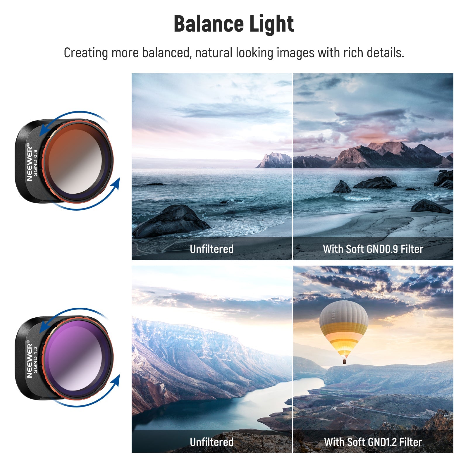 - Balanced Exposure for Landscapes- The soft edge gradient filters minimize the contrast between the bright sky and the darker landscape, resulting in natural looking images with rich details. The Soft GND0.9 and Soft GND1.2 filters reduce exposure by 3 and 4 stops respectively, ideal for varied lighting conditions