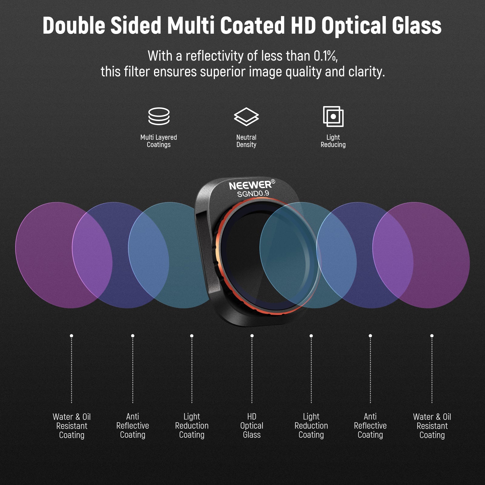 - Both Side Multi Coated HD Optical Glass- With multiple layers of multi functional coatings on both sides of the HD optical glass, these filters are water repellent, scratch resistant, and oil proof, ensuring long lasting optical quality in challenging environments