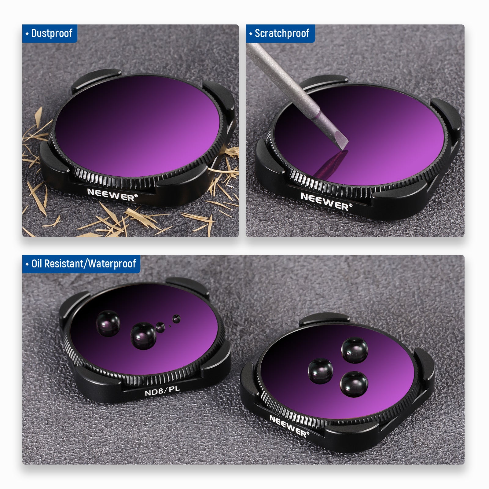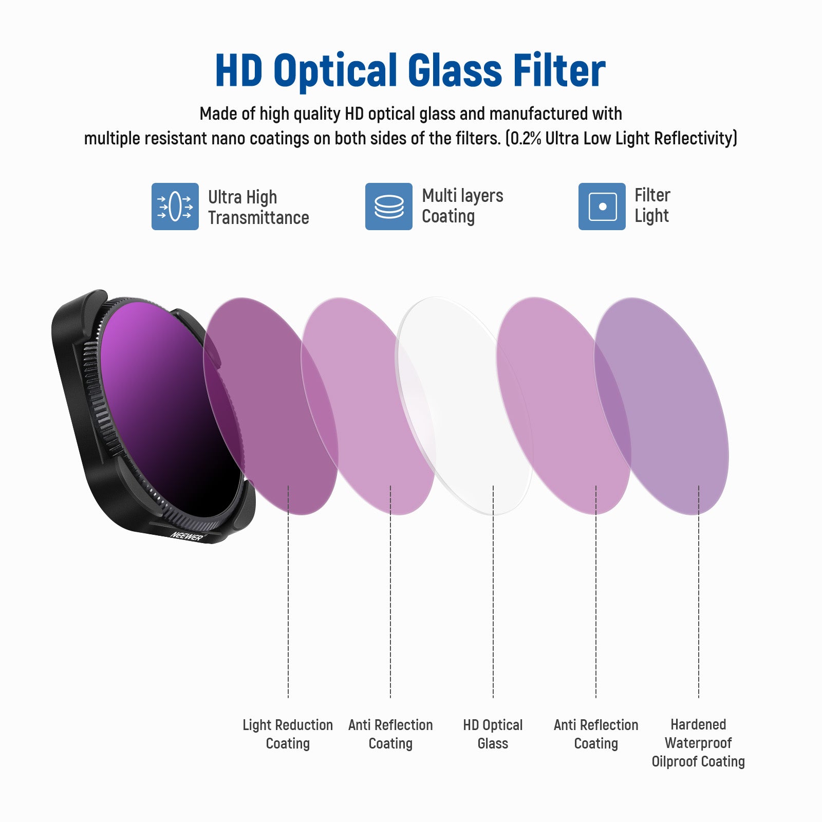 - Made of HD optical glass, manufactured with multi-resistant nanocoatings on both sides of the filters, and also featuring an ultra-low 0.2% light reflectivity, the filter surface can not only reduce glare and reflection but also resist oil and scratches in usage (Note: the filters themselves are not waterproof and can’t be used underwater).