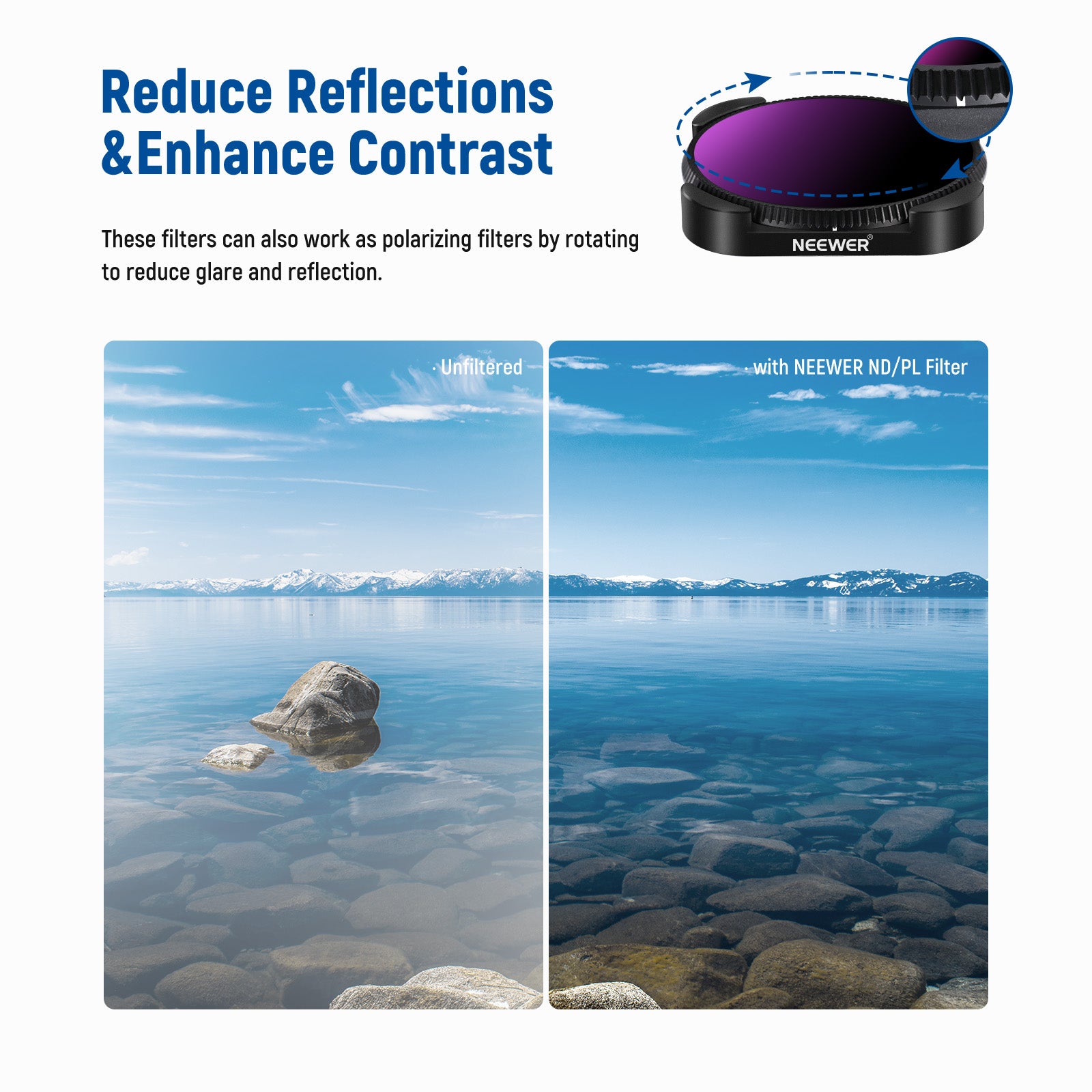 - The ND8/PL, ND16/PL, ND32/PL, and ND64/PL filters help reduce light entering your lens by a given amount, i.e. 3 f stops, 4 f stops, 5 f stops, and 6 f stops respectively. Choose one to reduce the light hitting on your lens sensor, enabling you to slow shutter speed and prevent overexposure, giving you more control over your footage quality. These filters can also work as polarizing filters by rotating to reduce glare and reflection.