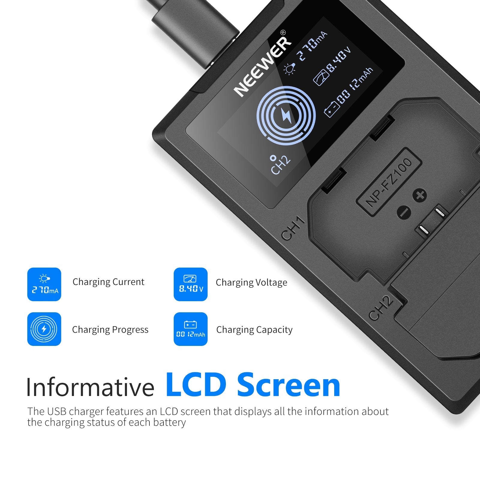 - Informative LCD Screen- The USB charger features an LCD screen that displays all the information about the charging status of each battery, including charging progress, charging current, charging voltage, and charging capacity