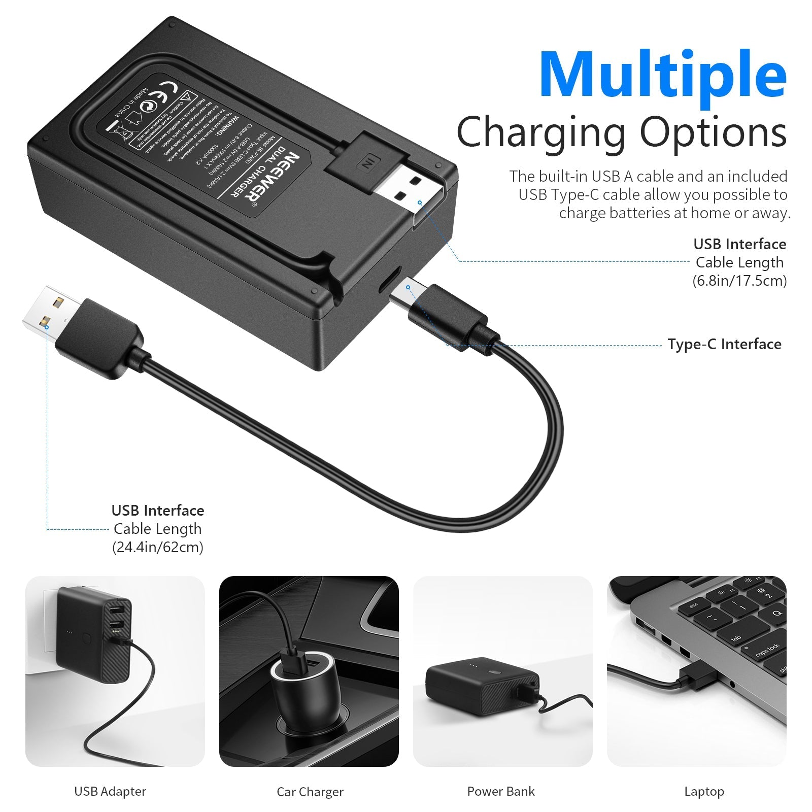 - Convenient USB Charging- The dual-slot USB charger can charge two batteries at the same time. The included Type-C charging cable help get power from wall sockets, power banks, car chargers, and USB ports on your computer. The 8.4V/1A input can recharge the batteries to 100% in just a few hours