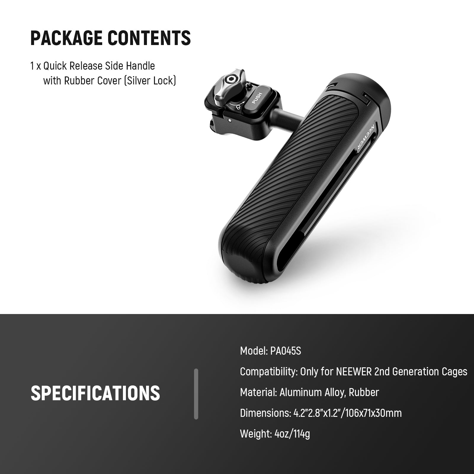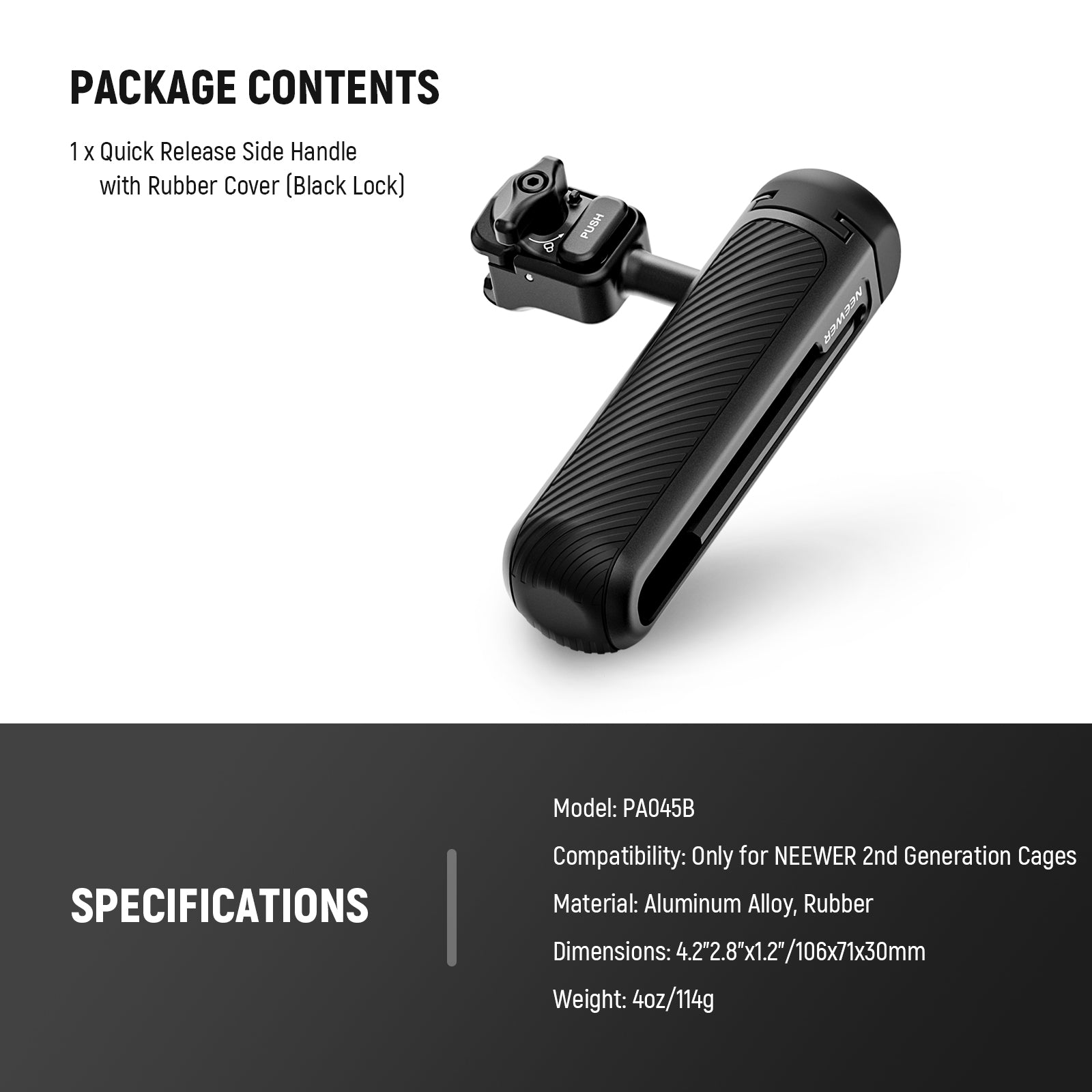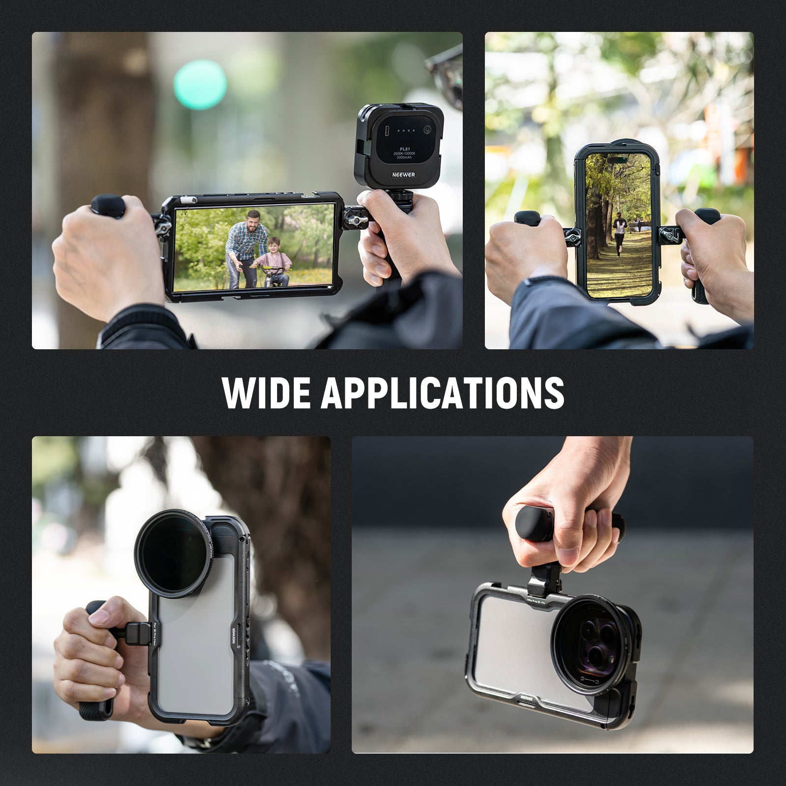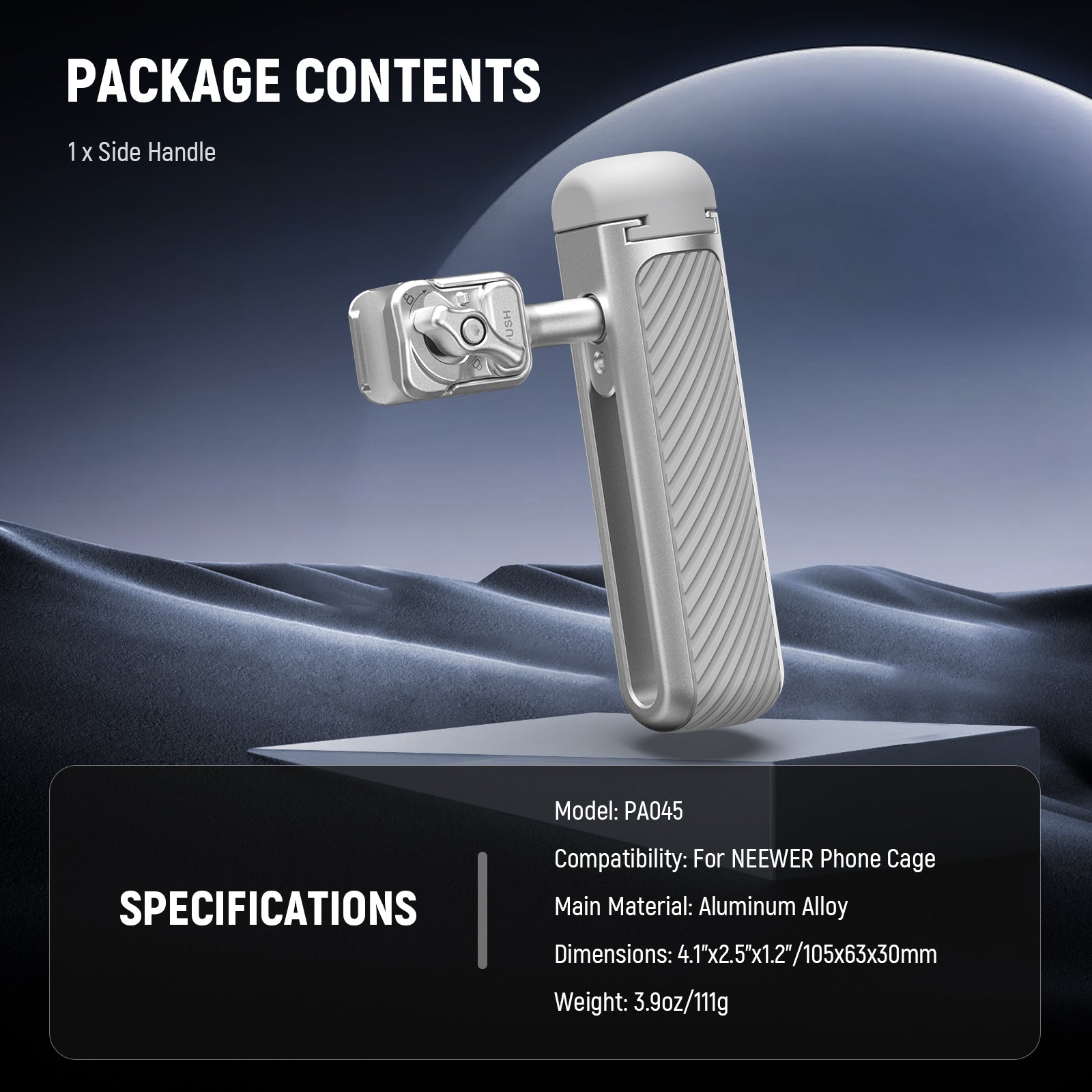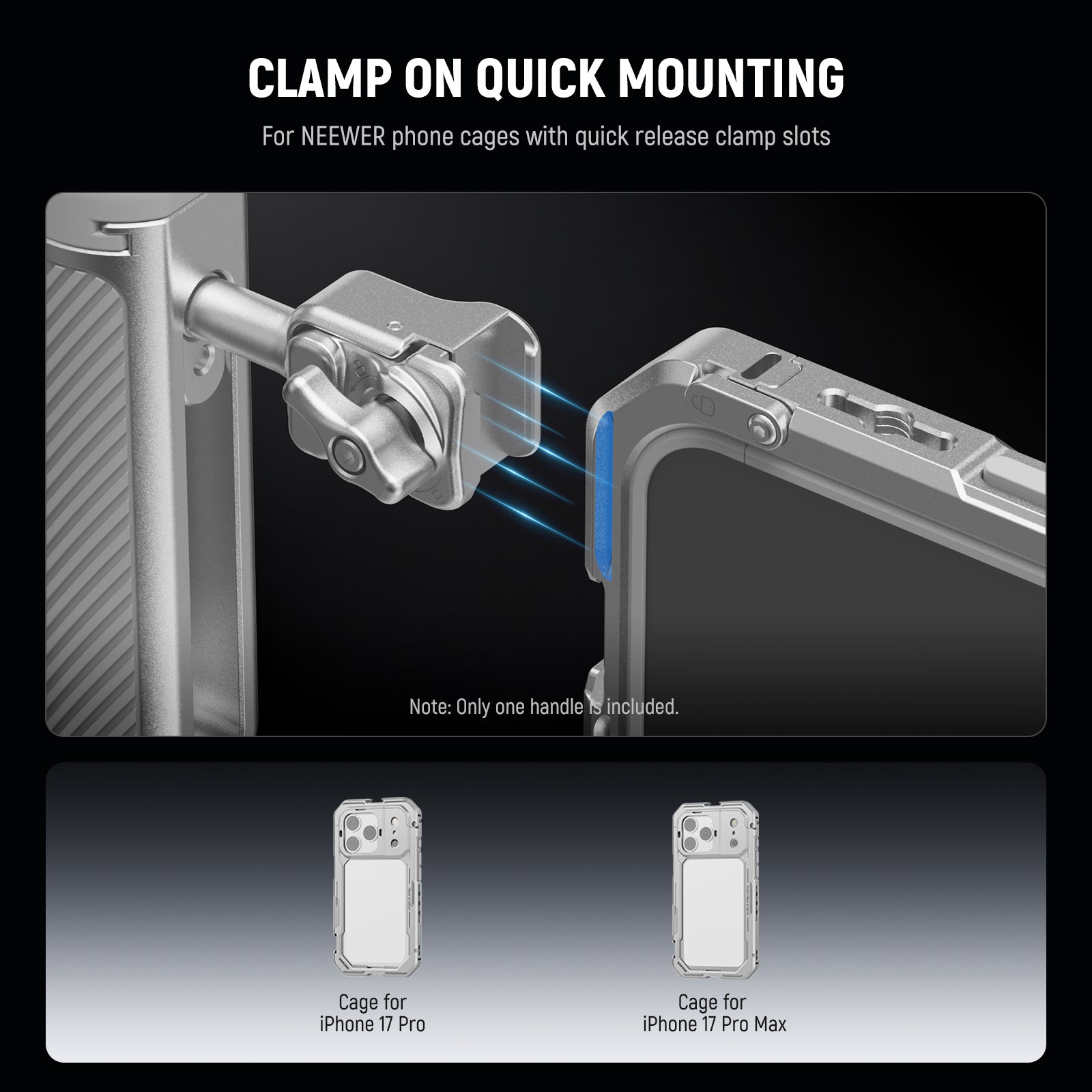For Phone Cages with Quick Release Slots- This side handle grip is speically designed for NEEWER phone cages with dedicated quick release slots, including PA143/PA144 for iPhone 17 Pro/Pro Max, PA073/PA074 for iPhone 16 Pro/Pro Max, PA043/PA044 for iPhone 15 Pro/Pro Max, and PA042 for Samsung Galaxy S24 Ultra
