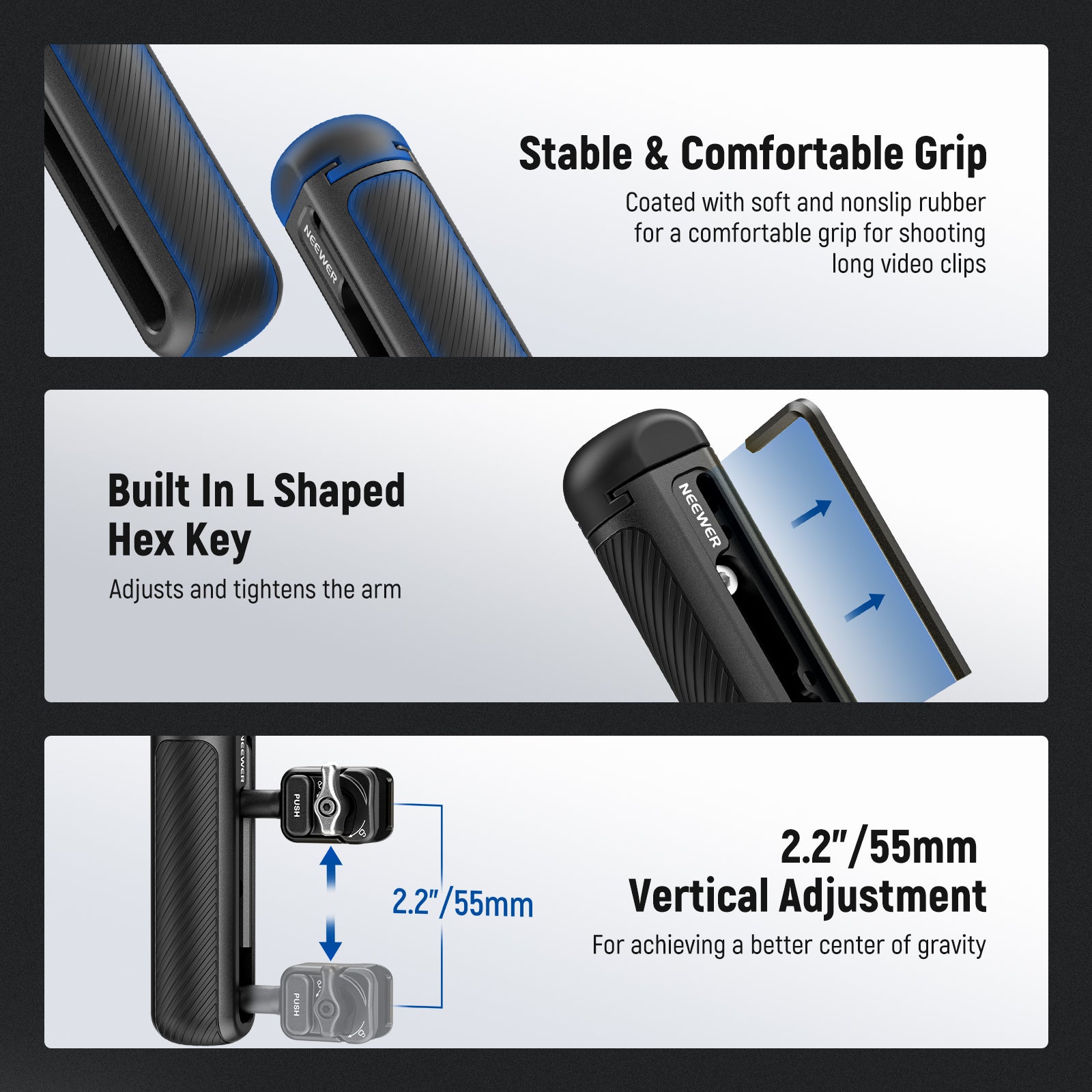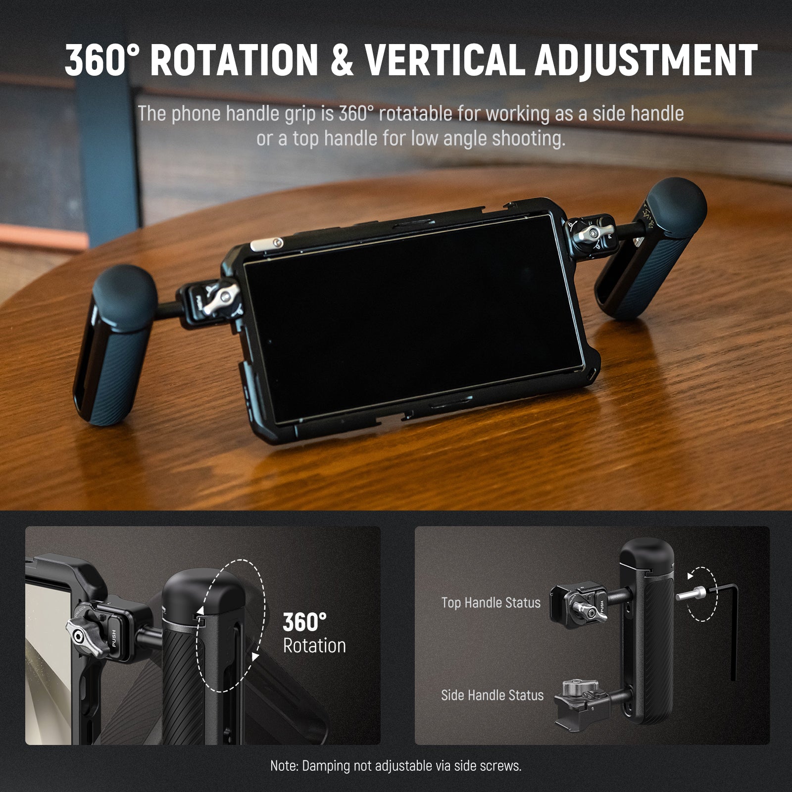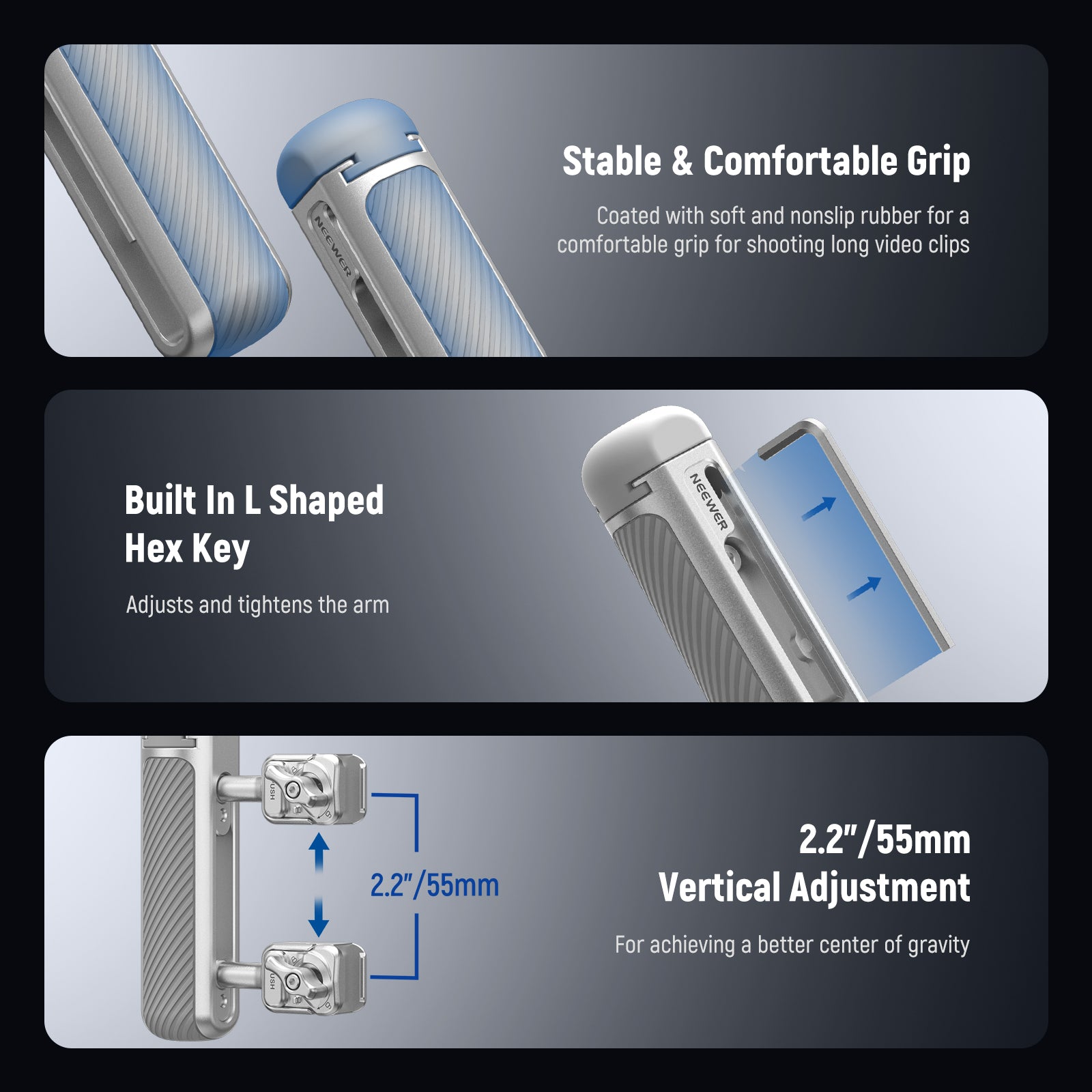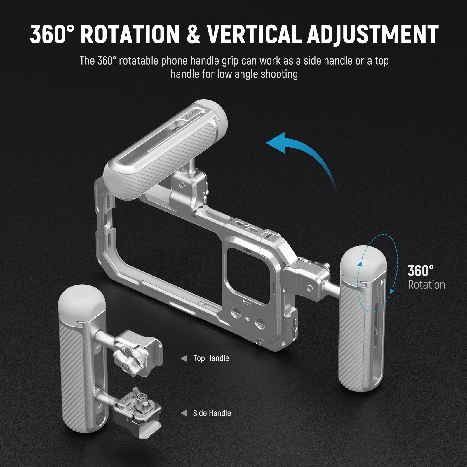- 360° Rotation & Vertical Adjustment- The phone handle grip is 360° rotatable for working as a side handle or a top handle for low angle shooting. It also supports 2.2"/55mm vertical adjustment for achieving a better center of gravity