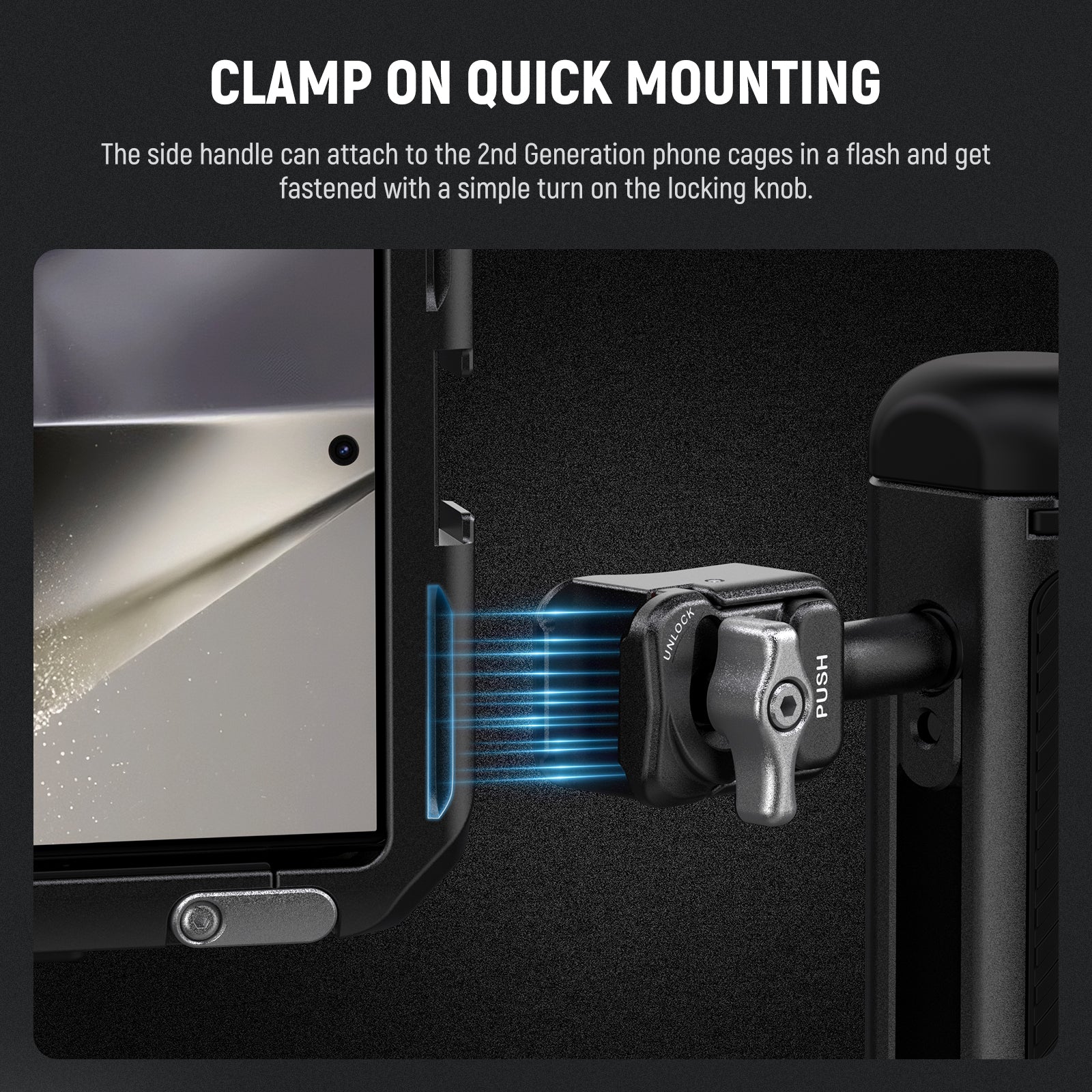 - Clamp On Quick Mounting- With a newly designed quick release clamp, the side handle can attach to the 2nd Gen phone cage in a flash and get fastened with a simple turn on the locking knob. This straightforward mounting process is perfect for outdoor video recording, filmmaking, vlogging, live streaming, mobile photography, and other content creations where time is at a premium