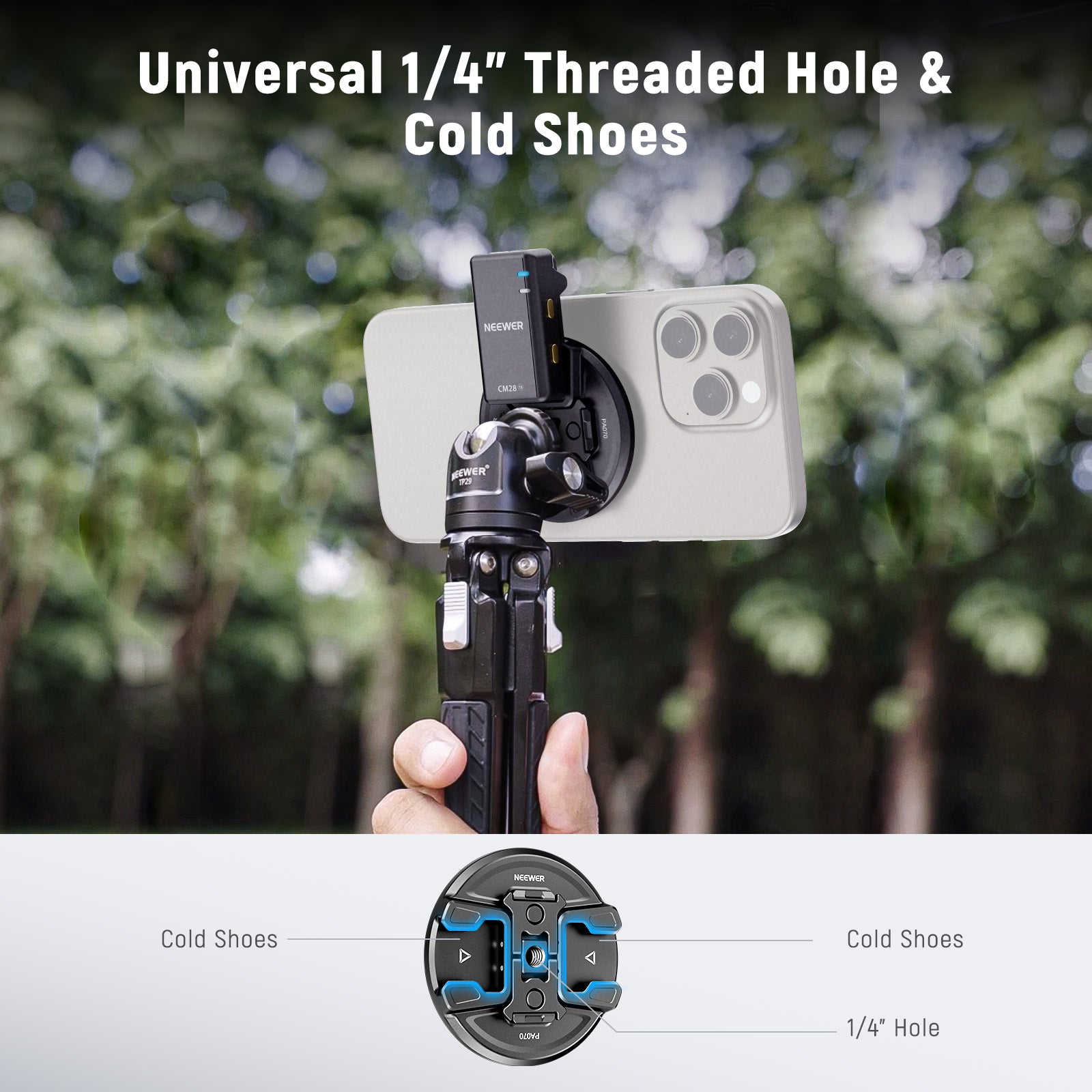 - Universal 1/4" Threaded Hole- A standard 1/4" threaded hole can connect to tripods, camera stands, selfie sticks, and other supports