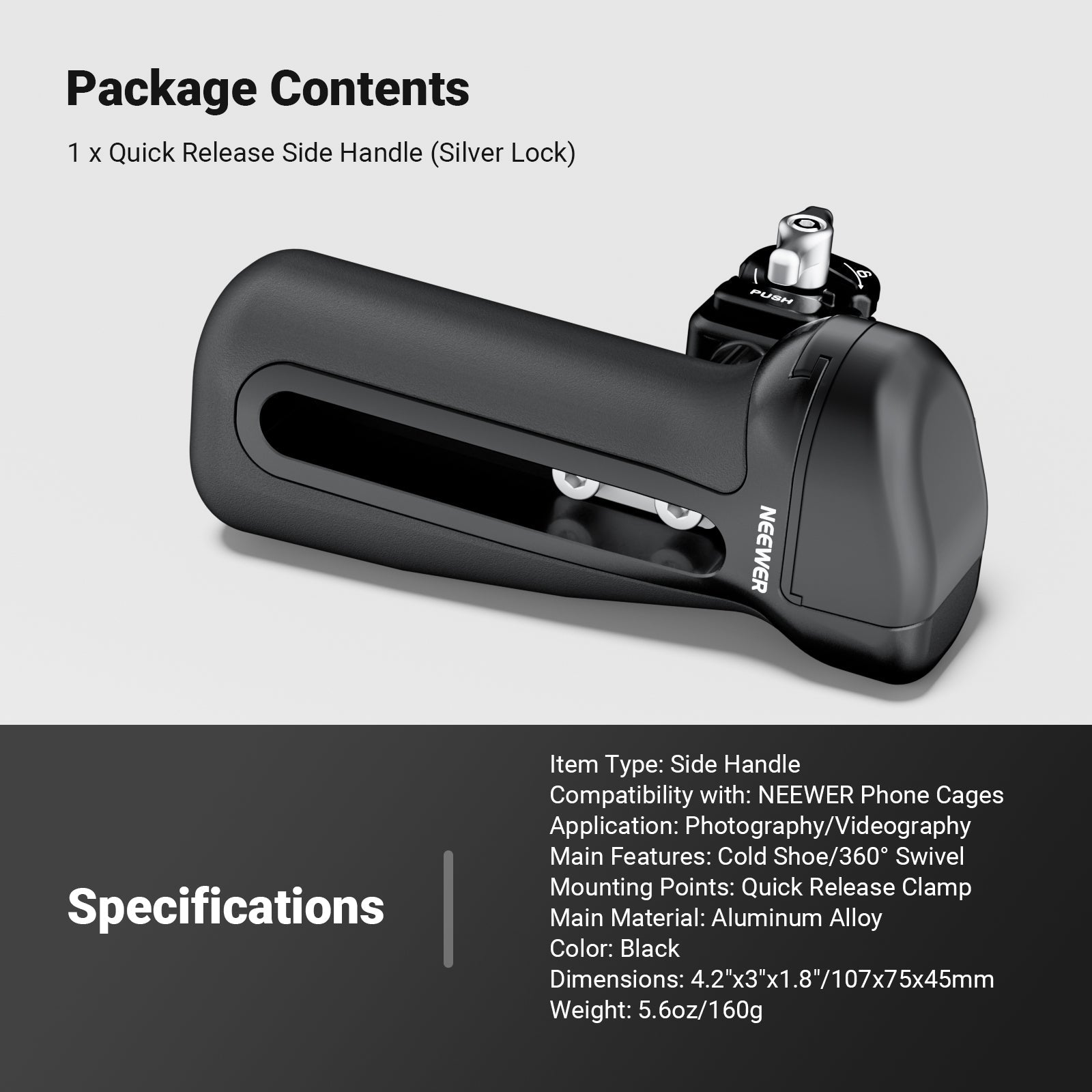- For NEEWER Phone Cages- Quick release side handle fits NEEWER phone cage stabilizers with QR mounting slots compatible with iPhone 17 Pro, 17 Pro Max, iPhone 16 Pro, 16 Pro Max, S25 Ultra, S24 Ultra, and more