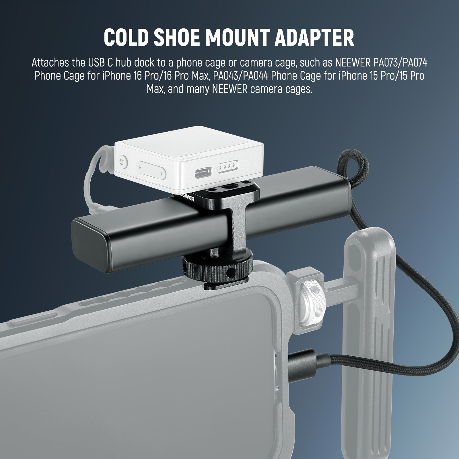 - Cold Shoe Mount Adapter- Attaches the USB C hub dock to a phone cage or camera cage, such as NEEWER PA073/PA074 Phone Cage for iPhone 16 Pro/16 Pro Max, PA043/PA044 Phone Cage for iPhone 15 Pro/15 Pro Max, and many NEEWER camera cages. Also compatible with SmallRig phone cages and camera cages