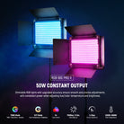 - Upgraded Dimmable RGB Light- With upgraded cooling and lighting control system (constant 50W lighting, no flicker or color shift), the 660 PRO II breaks the minimum brightness limit from 1% slight bright (brightness and power can reach a true 1%) to 100% ultra bright, as well as 3200K-5600K color temperature and 360° full RGB range, ensuring smooth and precise adjustment as a key light or soft fill continuous light. Power and brightness remain consistent when adjusting tone/color temperature