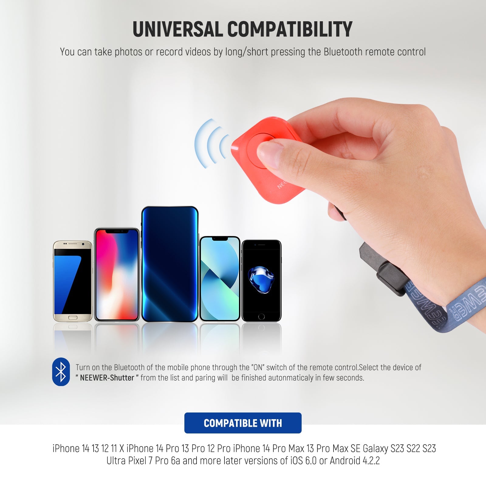 - Long Wireless Range- This shutter release allows you to wirelessly take pictures and videos from up to 33ft (10m) away — no need to reach your arm to the phone screen again