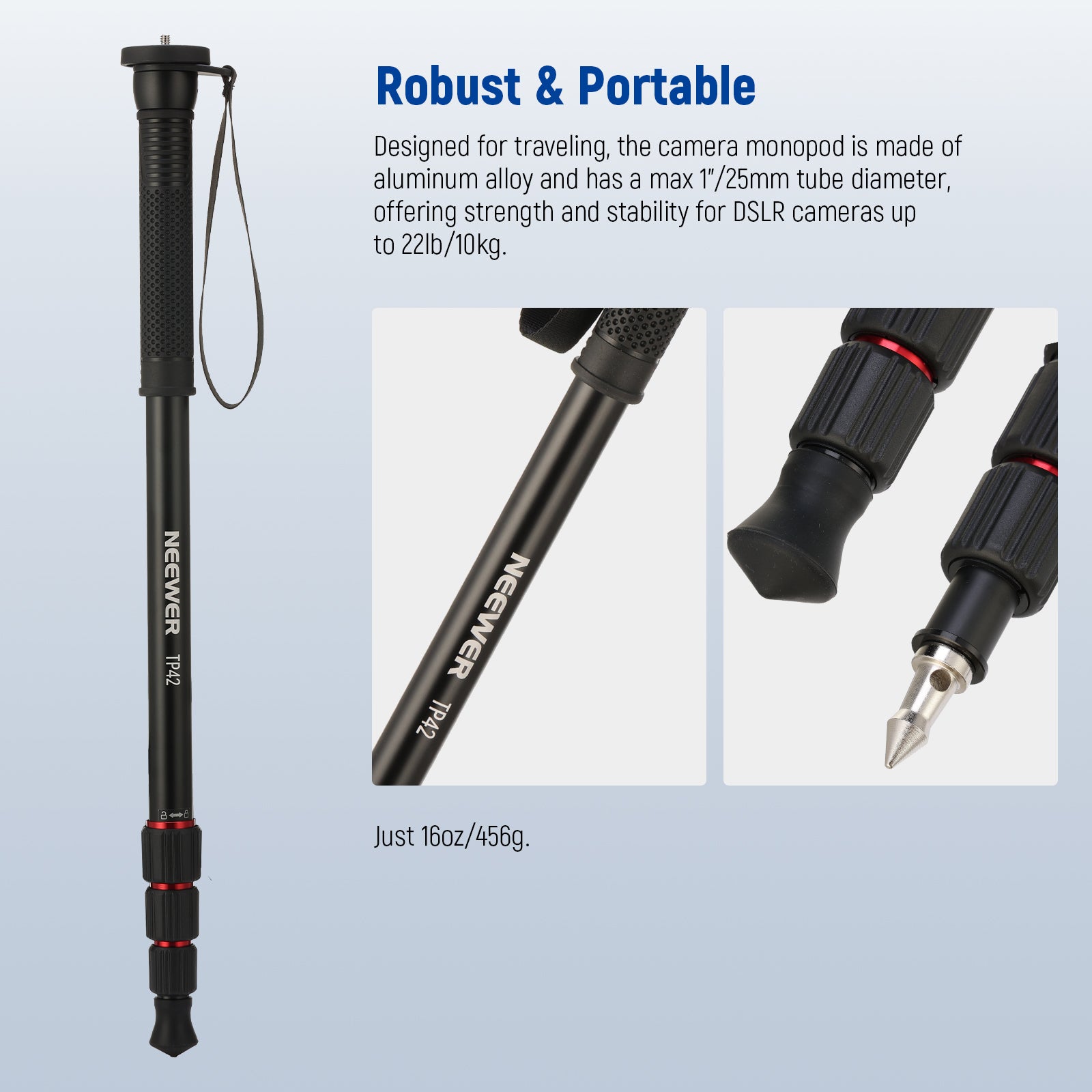 - Robust & Portable- Designed for traveling, the monopod is made of aluminum alloy and has a max 1"/25mm tube diameter for DSLR cameras up to 22lb/10kg. Weighing just 16oz/456g, it is highly portable. Unlike heavy tripods (tripod stands), use it as a selfie, walking, hiking stick, or trekking pole. Versatile content creator essential and influencer must have for exploring outdoors, Europe travel vlogging, video shooting, taking selfies with friends, or capturing stunning landscapes
