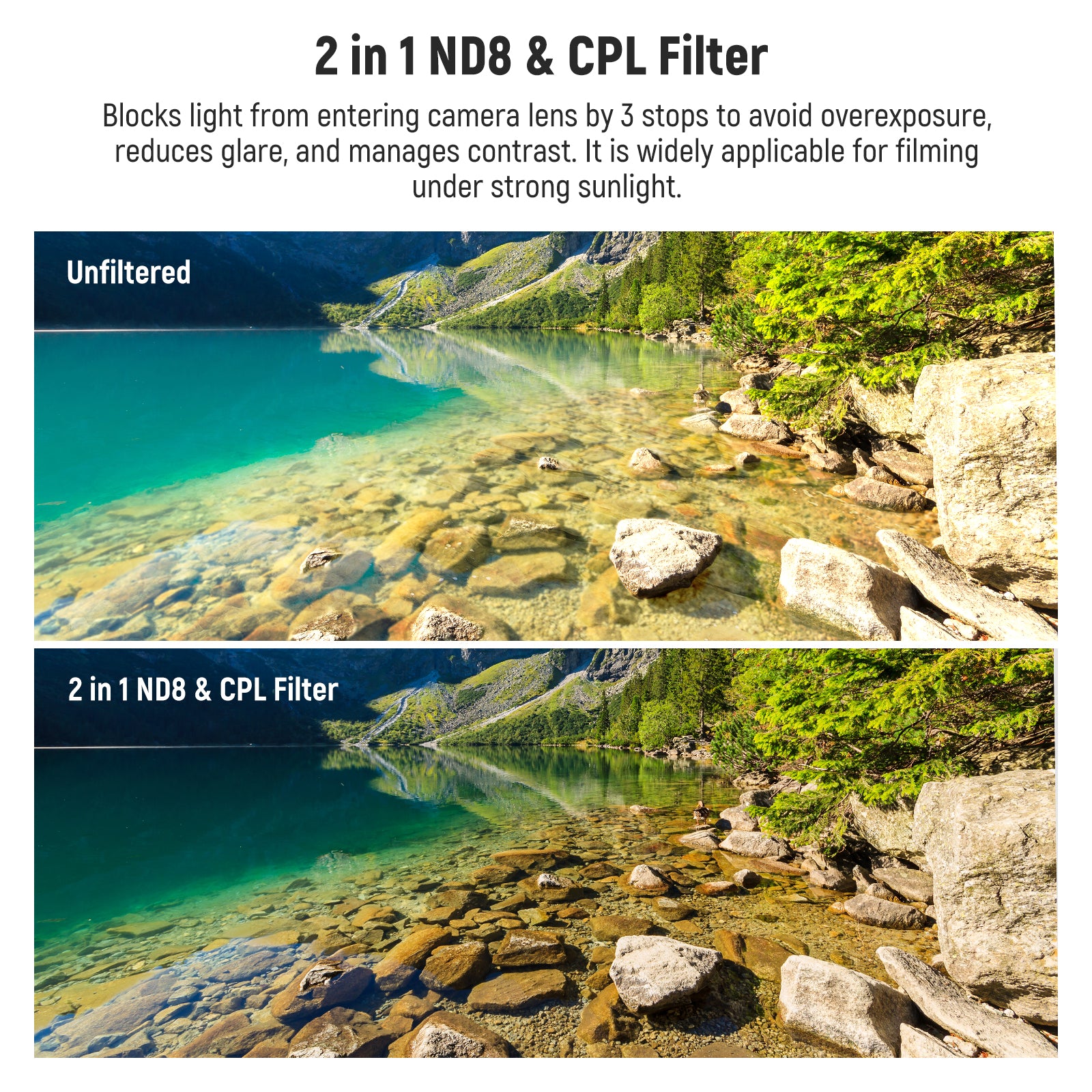 - CPL/ND8 Filter 2 in 1- The 2 in 1 ND8 & CPL filter does the job of both a neutral density filter and a CPL filter. It not only blocks light from entering camera lens by 3 stops to avoid overexposure, but also reduces glare and manages contrast. With ND8 neutral density filter and CPL filter combined in one, it is widely applicable to filming under strong sunlight
