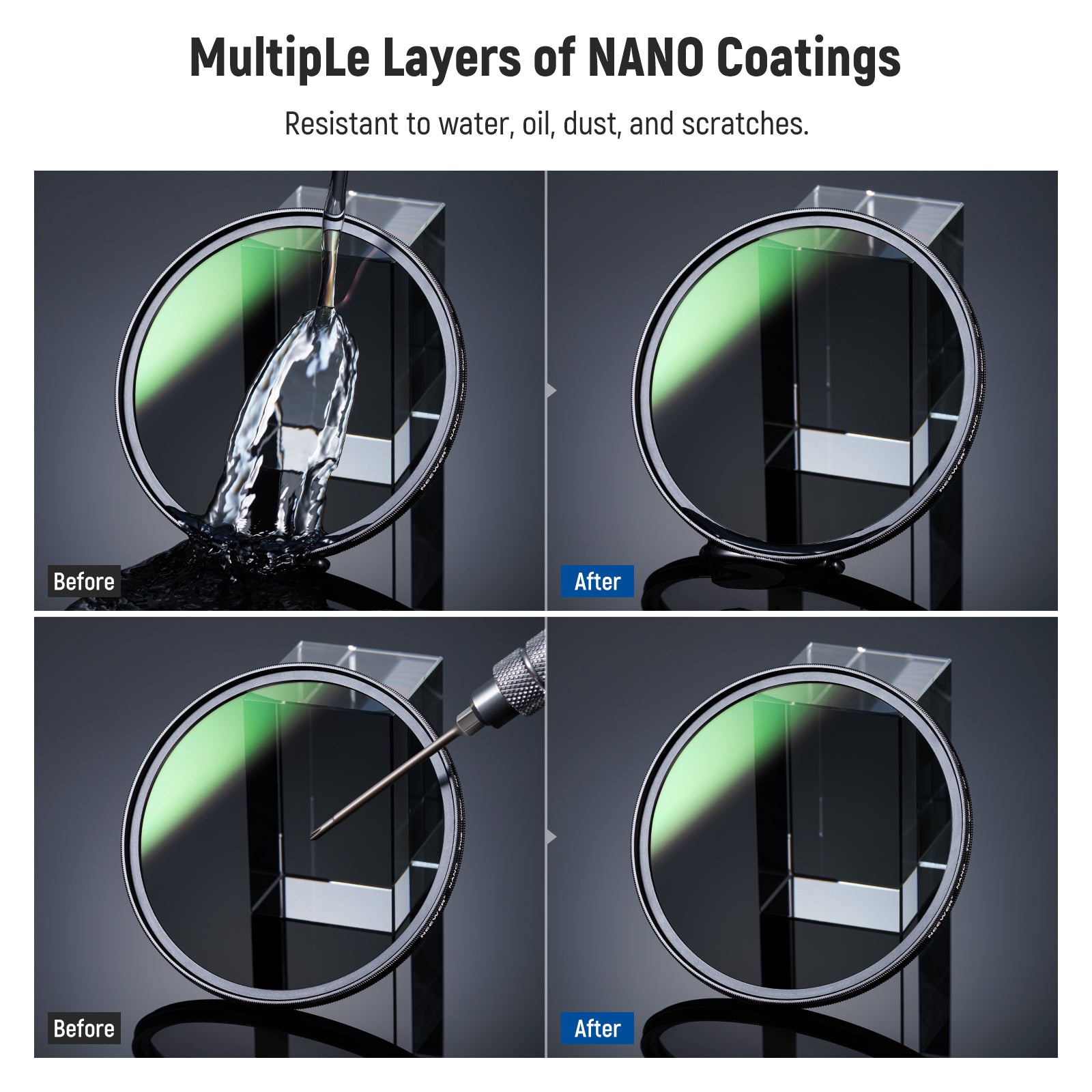 - Multiple Coated HD Optical Glass Build- Made of high definition optical glass with excellent light transmission, the versatile filter helps take crystal clear images. Both sides of the filter feature multiple layered protective nanocoatings to make it hard enough to resist scratches and impact. It’s also resistant to water, oil, dust, fingerprints, and smudges