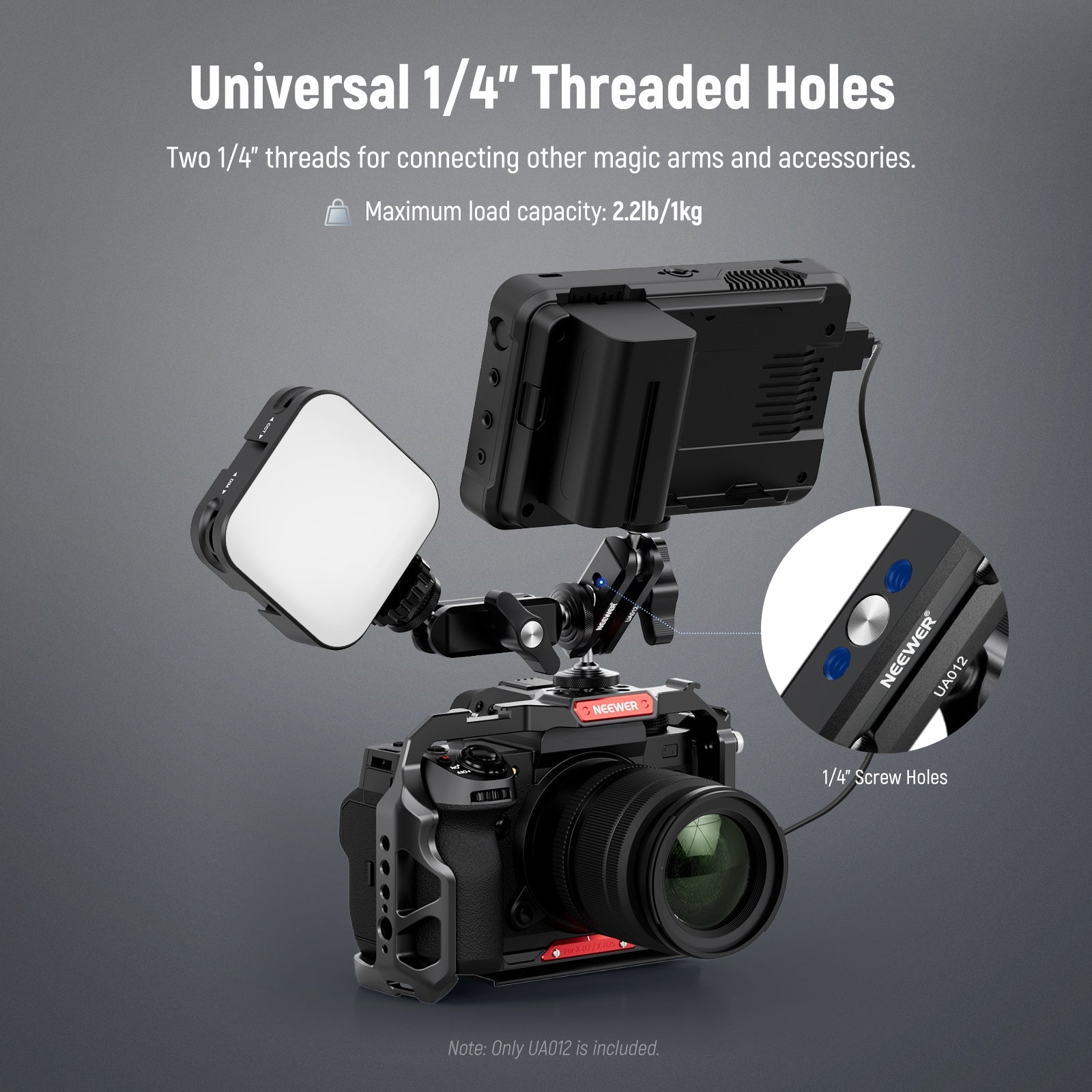 - Universal 1/4" Screws & Threaded Holes- Two 1/4" screws can attach the magic arm to a camera cage, top handle, or tripod and mount a field monitor, LED fill light, smartphone holder, microphone, or vlog camera at the same time. The magic arm also has two 1/4" threads for connecting other magic arms and accessories