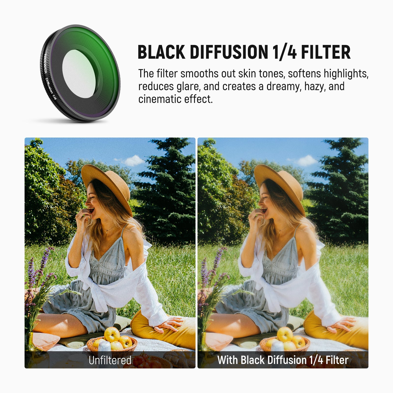 - Dreamy & Cinematic Effect- 1/4 black diffusion filter smooths out skin tones, softens highlights, reduces glare, and creates a dreamy and cinematic effect for portrait photography, video recording, and vlogging