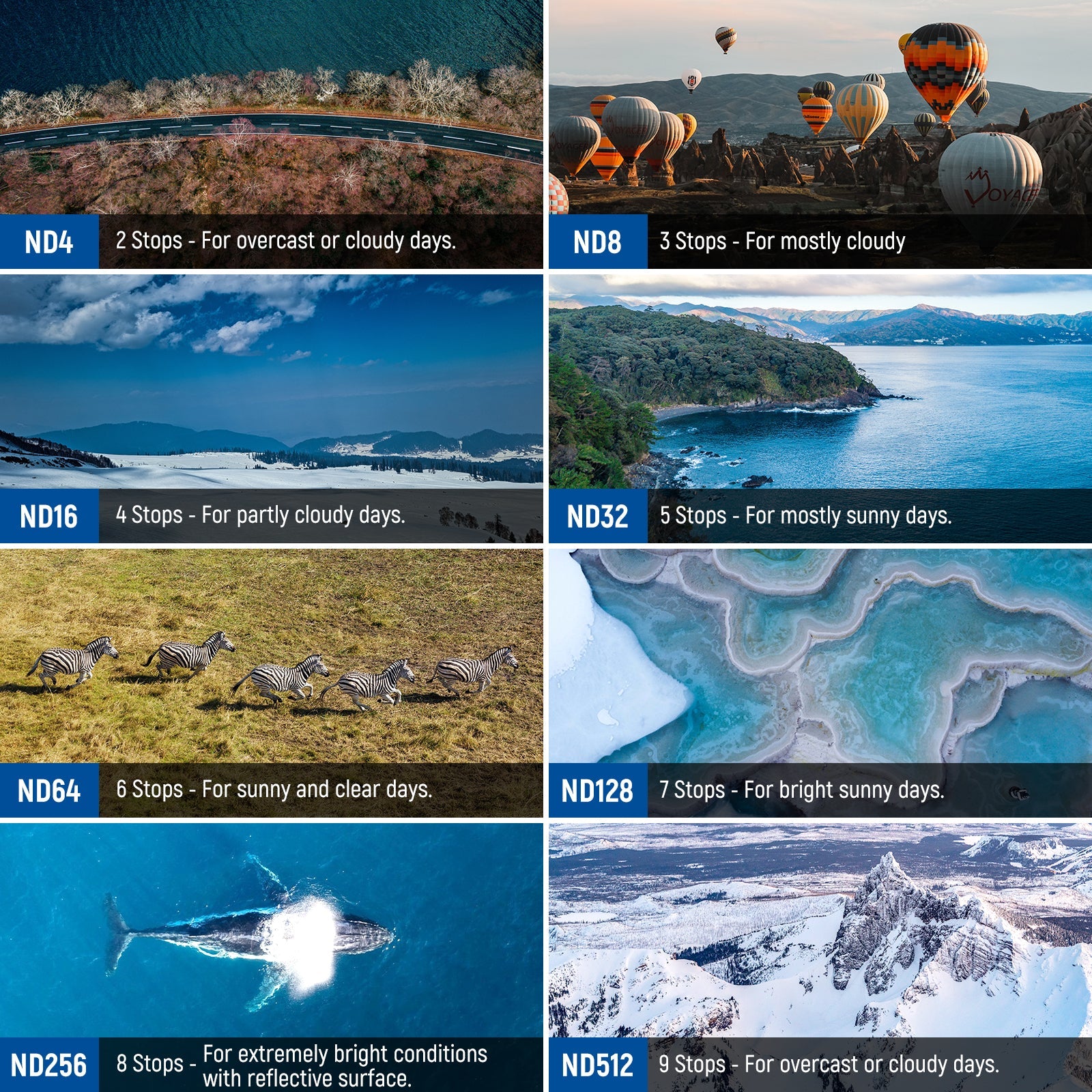 - Flexible Balanced Exposure Control- The ND2-32 filter with 1 to 5 stops of light reduction is suitable for moderate lighting conditions, enabling slower shutter speeds and wider apertures. The ND32-512 filter with 5 to 9 stops of light reduction is more appropriate for bright lighting situations. It allows for longer shutter speeds, even in intense light, offering creative effects such as smooth waterfalls or blurred motion