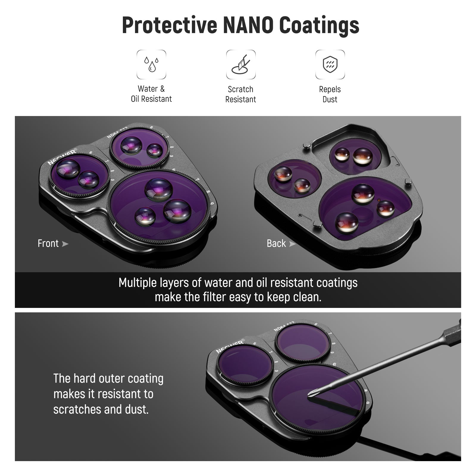 - NANO Coated HD Optical Glass- With 30 layers of multi functional NANO coatings on both sides of the HD optical glass, these filters are water repellent, scratch resistant, and oil proof