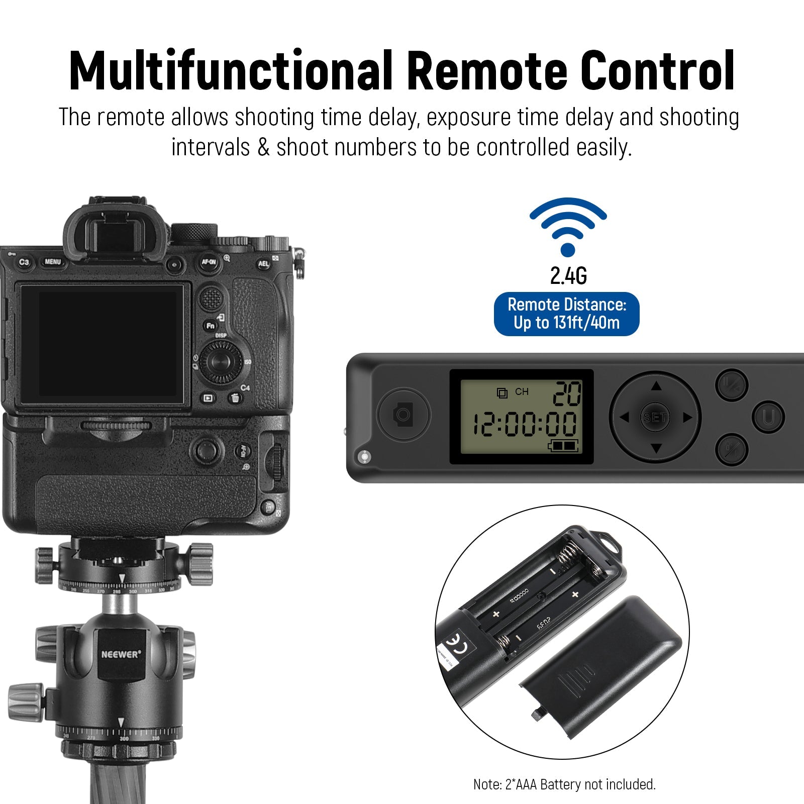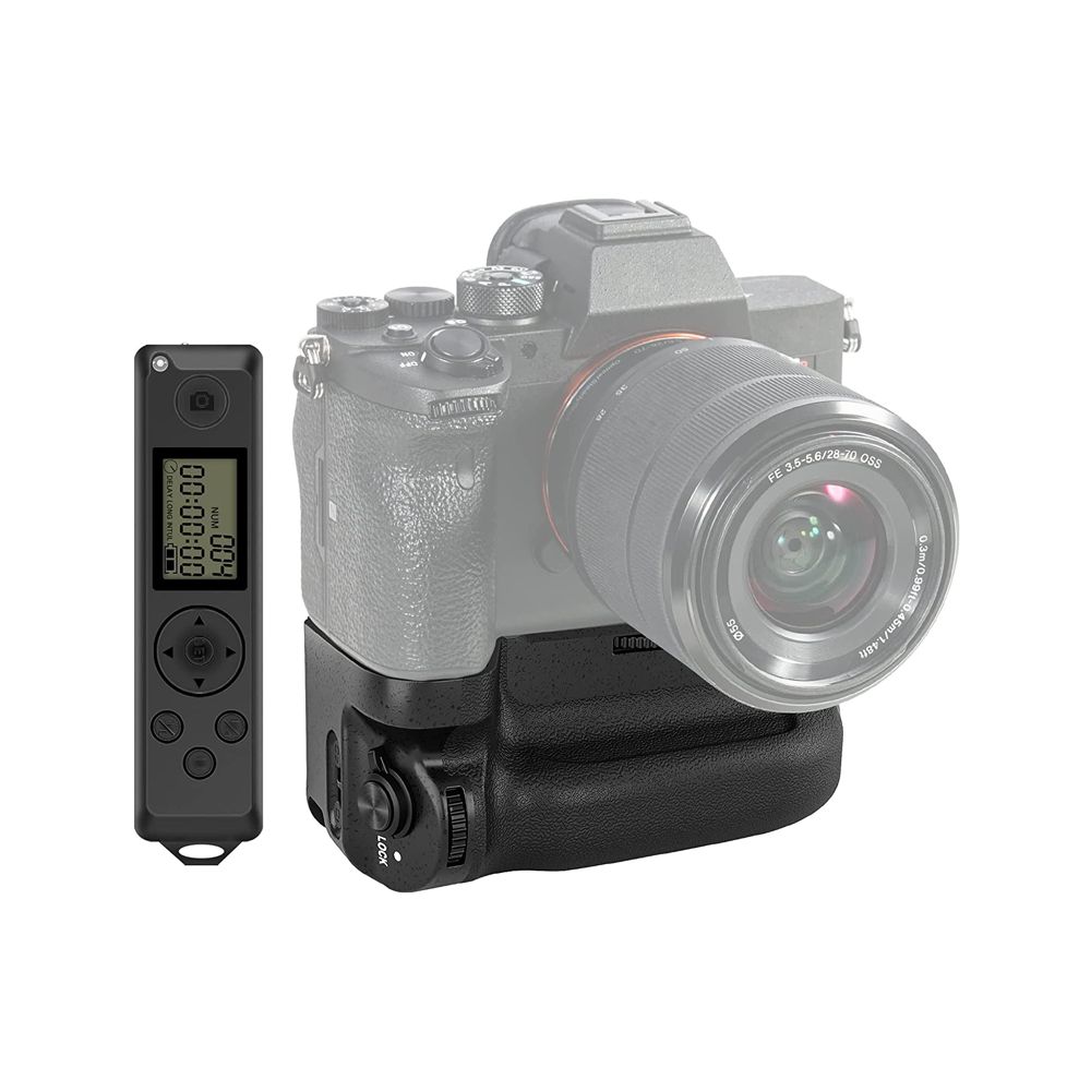 Multifunctional Remote Control- The remote control pairs with the battery grip via 2.4G transmission and the control distance is up to 131ft/40m. The multifunctional remote with LCD display supports focusing/photography, and infrared shooting and the photographer is free to set delay time, exposure time, intervals and shoot numbers. In addition, LCD screen locks supported