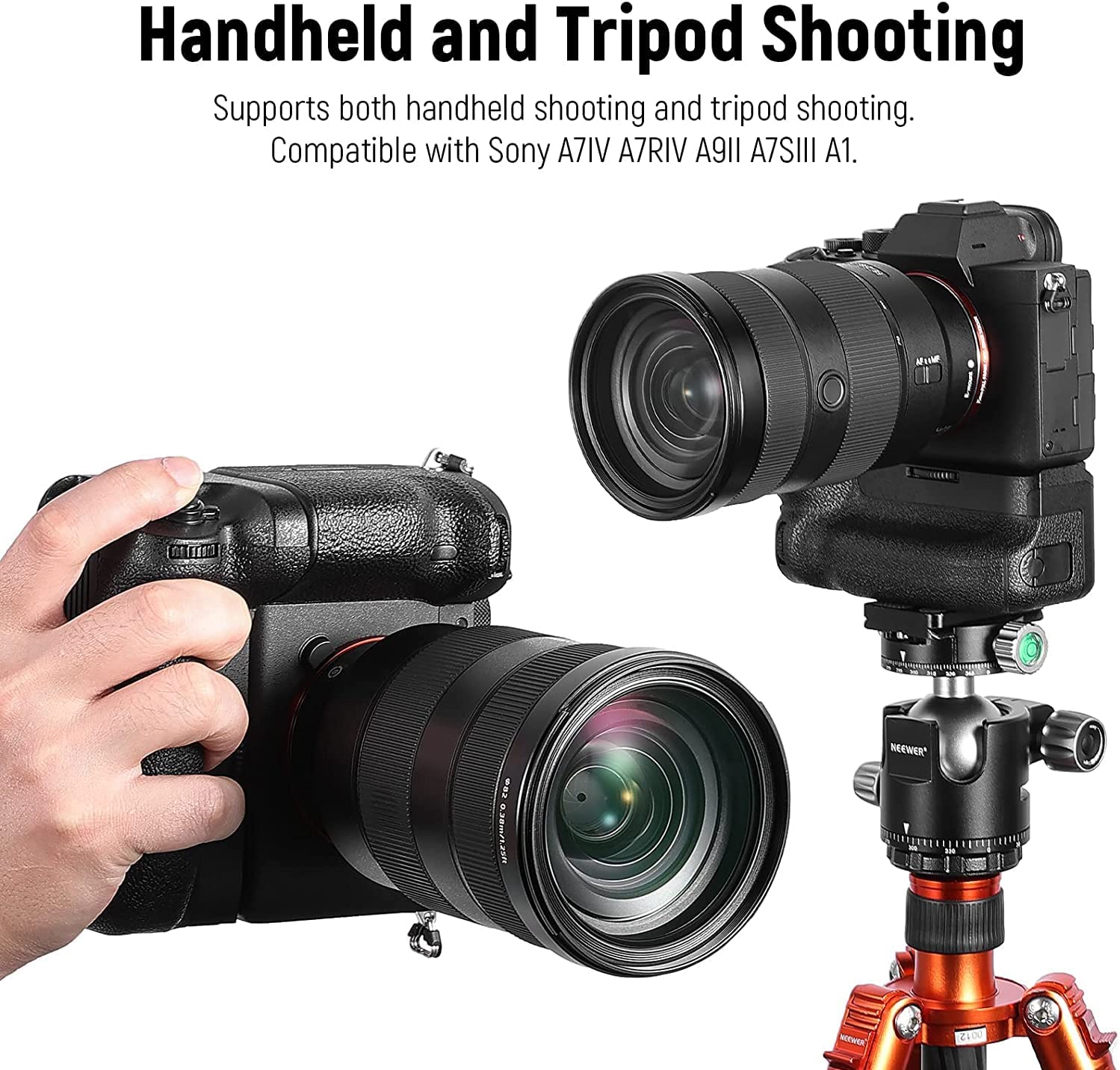 - Battery Grip Compatible with Sony- Ergonomically designed, this battery grip provides a comfortable handheld grip to hold your camera. By storing one or two NP-FZ100 batteries, the grip is compatible with Sony A9II A7IV A7RIV A7SIII A1 Cameras BG A7IV to extend camera battery life for longer shooting time. Via its bottom 1/4” threaded hole, it can also be mounted on a tripod