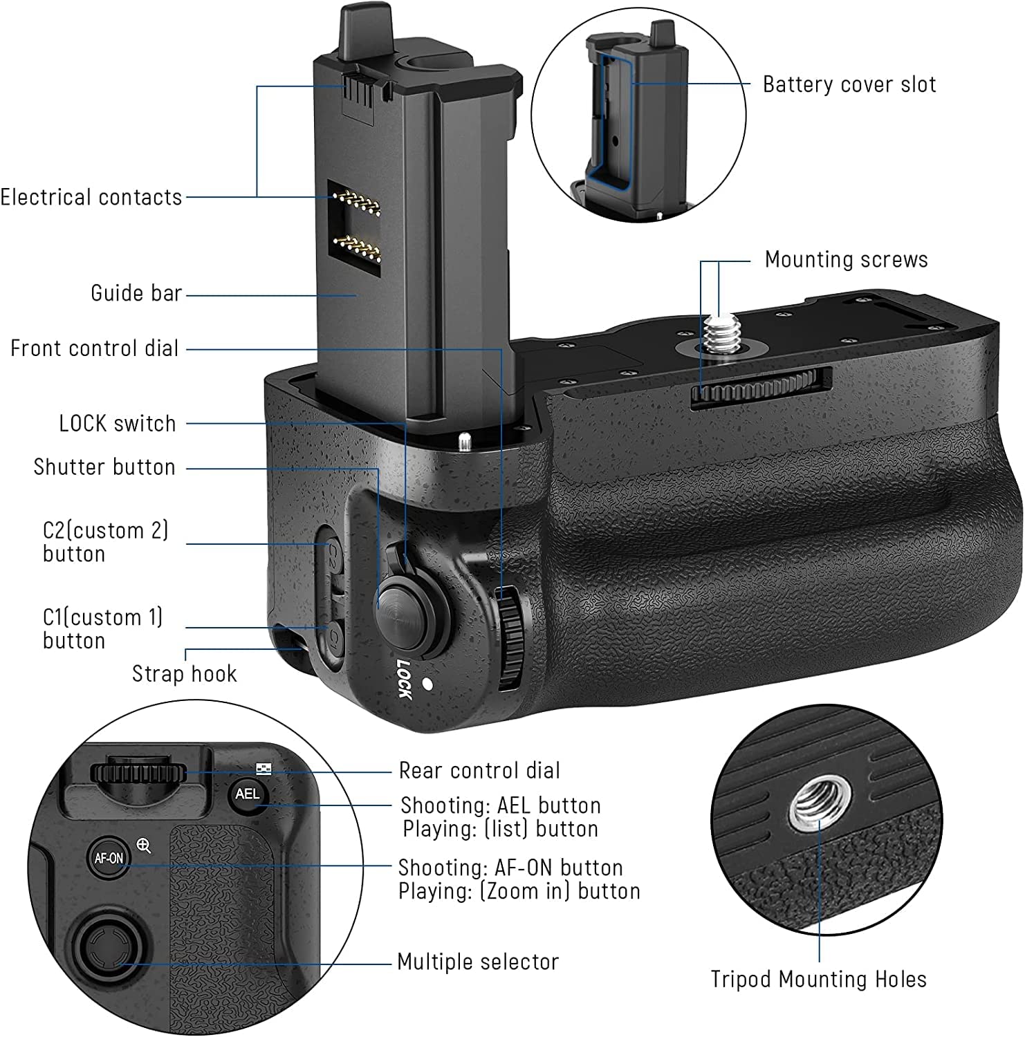 Versatile Grip for Easy Operation- When mounted on your camera to hold one or two batteries, this battery grip also makes photography much easier with featured designs: shutter release button, AF/ON(Auto Focus/Manual Focus), C1/ C2 custom navigation button, AEL(AE lock), front and rear thumb wheel dial control
