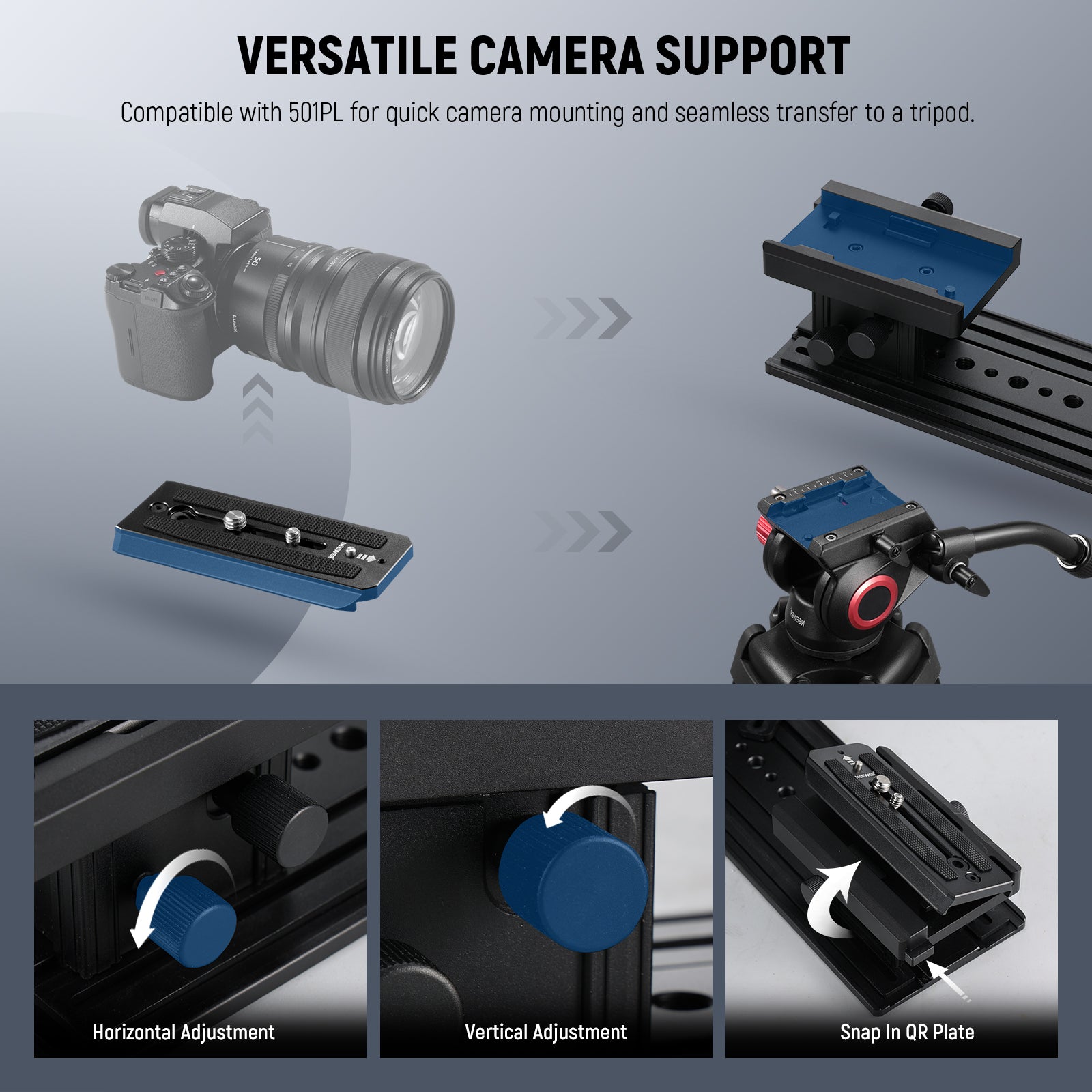 - Upgraded Snap in QR Plate & Vertical Horizontal Adjustable- Now compatible with 501PL plate, the upgraded quick release camera mount QR plate camp base lets you immediately lock the camera plate by pressing it right from the top without alignment. It also enables you to transfer the camera to a tripod using the release button and supports vertical (2.7"-3.9"/69-100mm)and horizontal (6.7"/171mm) adjustment for camera positioning