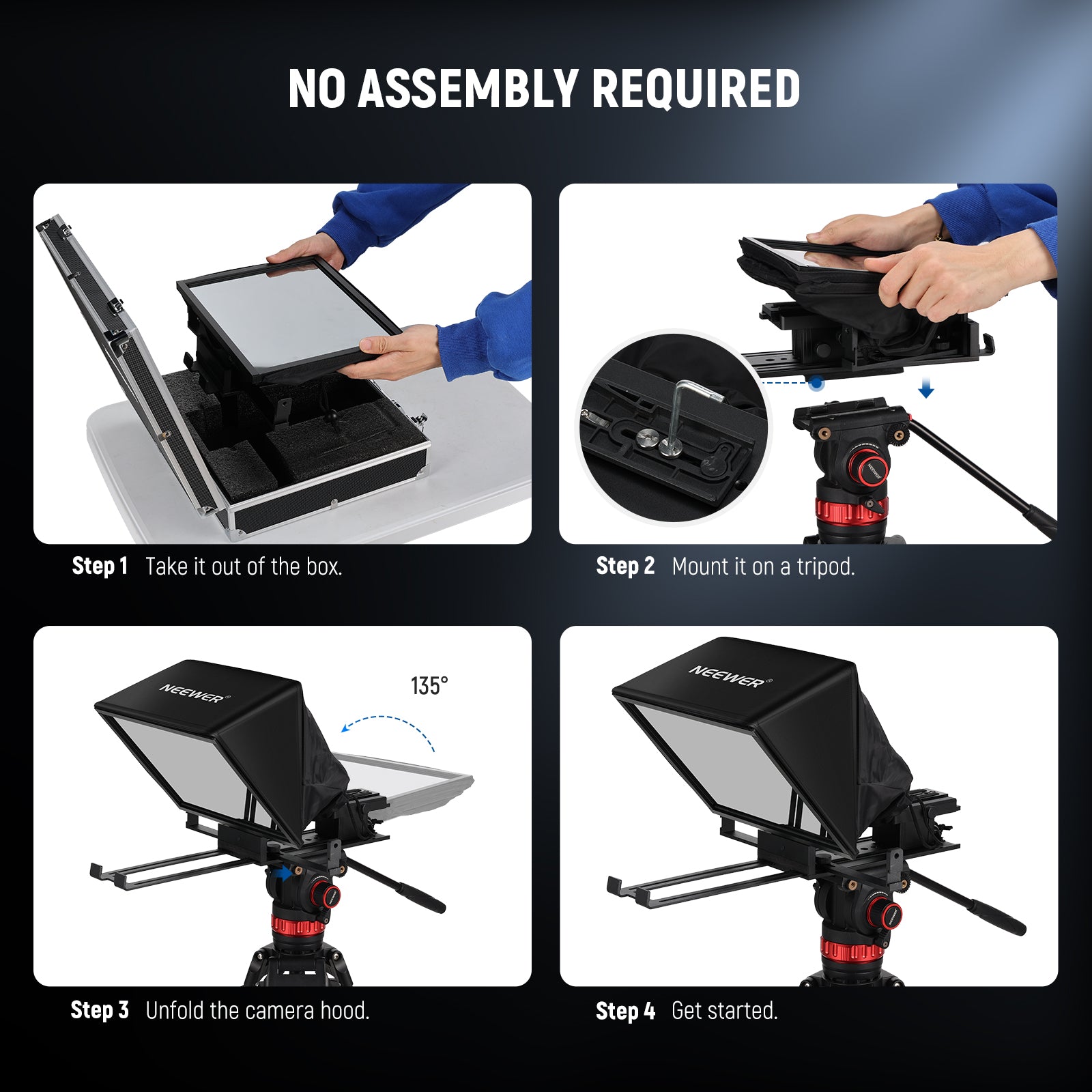 - Foldable & Instant Setup Without Assembly- NEEWER X14 II is an all in one teleprompter that requires no assembly and is ready to use when taken out of the box. A convenient tool for any type of video recording, it is perfect for online courses, speeches, presentations, news broadcasting, tutorials, and more. When not in use, fold it flat and fit it inside the portable carry case for storage and protection