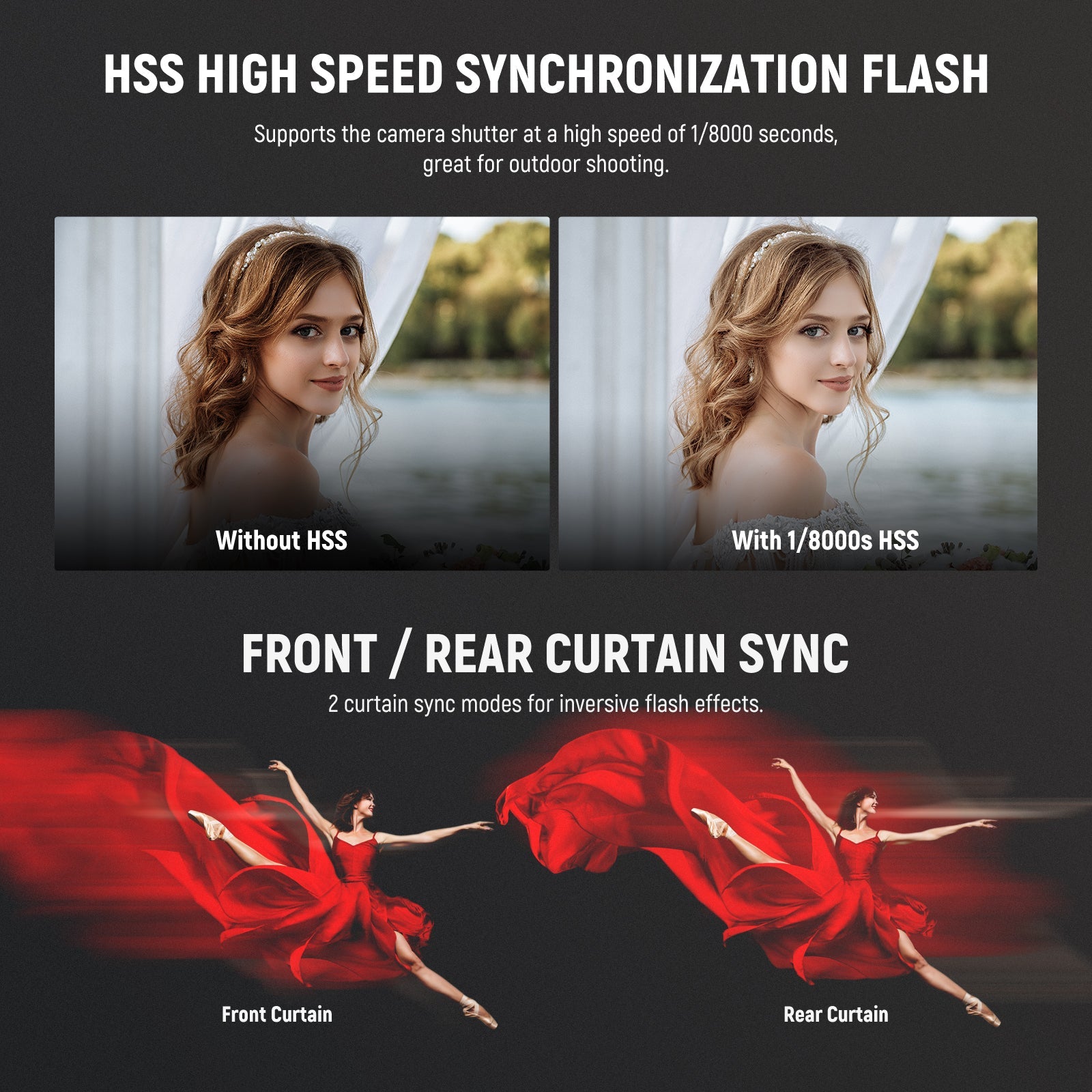 - Sync Mode: High speed sync (up to 1/8000s), front or rear curtain sync