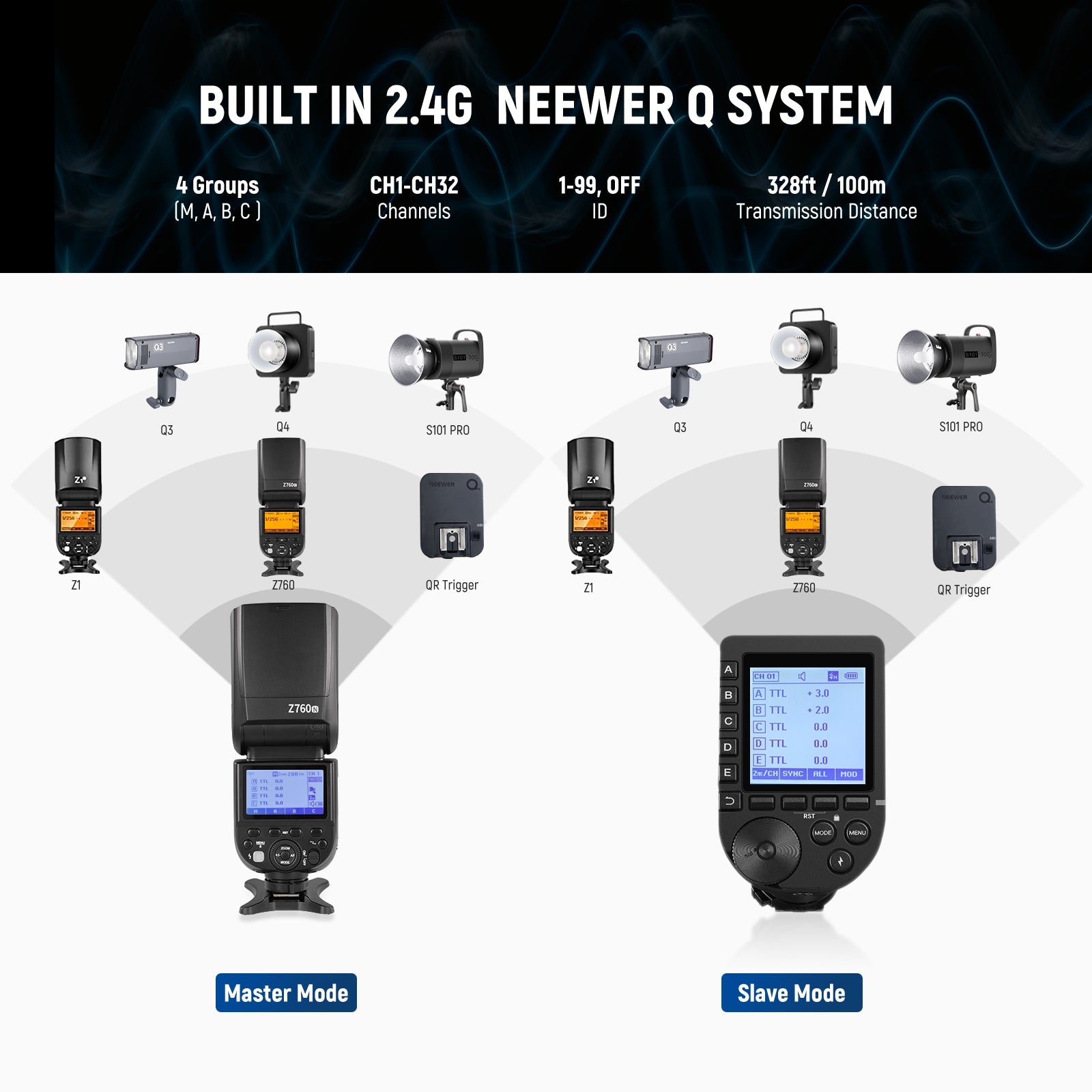 - Built in 2.4G Wireless Q System- Has 4 wireless control groups (M/A/B/C), 32 channels (1-32), and 99 IDs (1-99). Compatible with the QPro-N TTL transmitters (not included). Use it as a Master/Slave flash to control other Q system flashes with a transmission range of up to 328'/100m (no obstacles). The light illumination is uniform and the output is stable, which greatly expands your creative possibilities for flash photography. USB firmware update supported