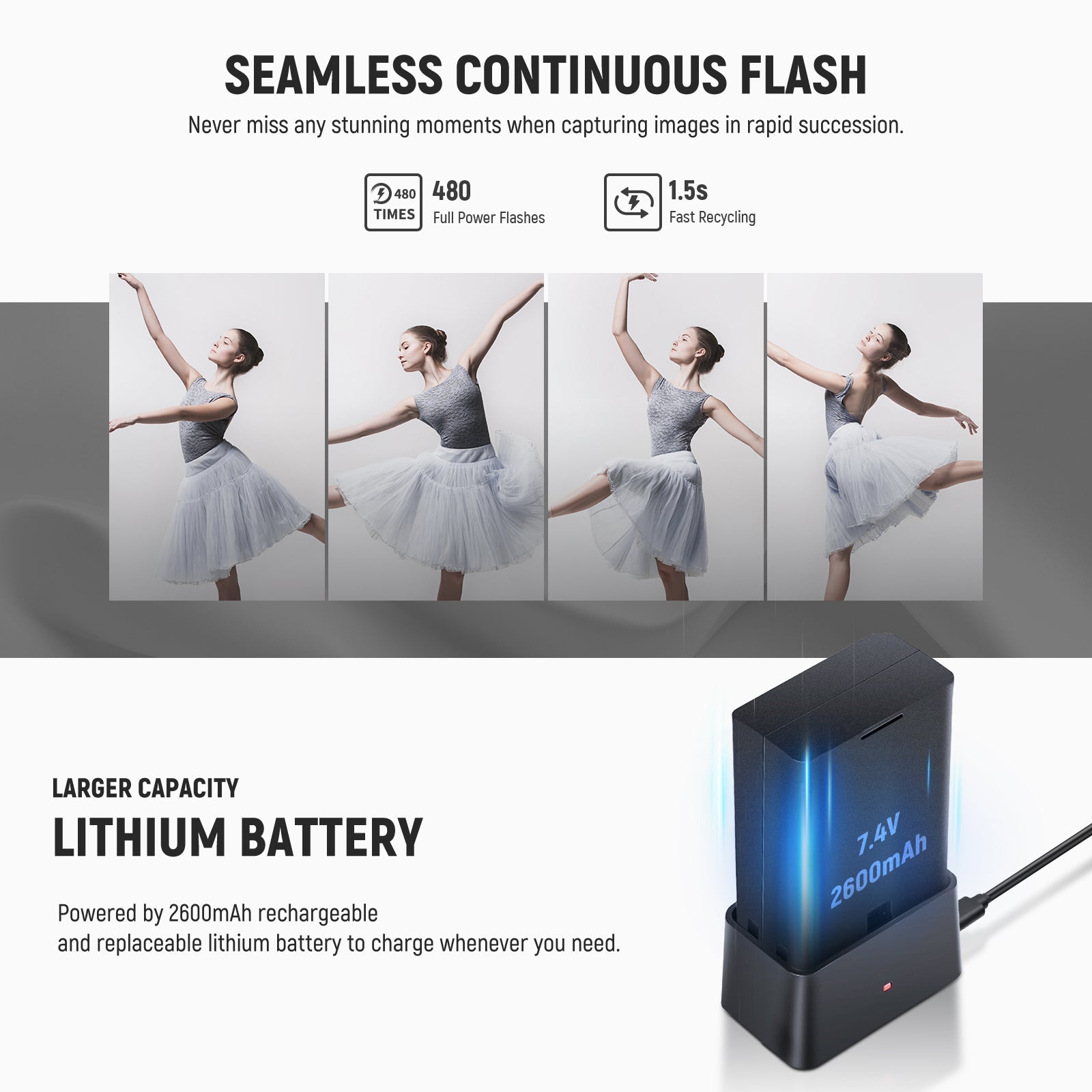 - High Capacity & Fast Recycling- The 7.4V 2600mAh larger capacity lithium battery with included USB charging base and UK plug adapter provides 480 full power flashes, 1.5s fast recycling time and a flash duration from 1/180 to 1/20000s. It supports 1/8000s high speed sync and front and rear curtain sync, capturing stunning moments